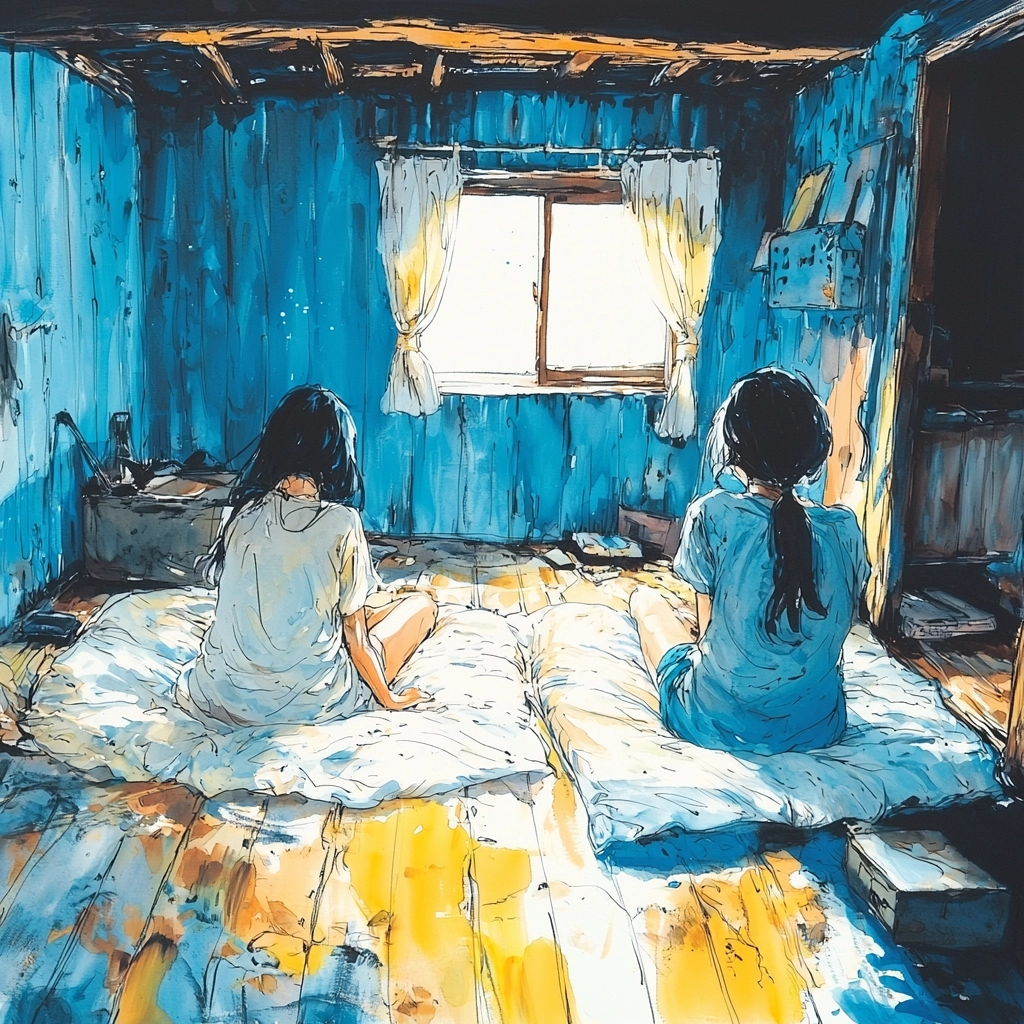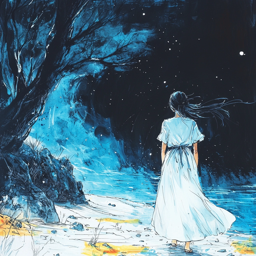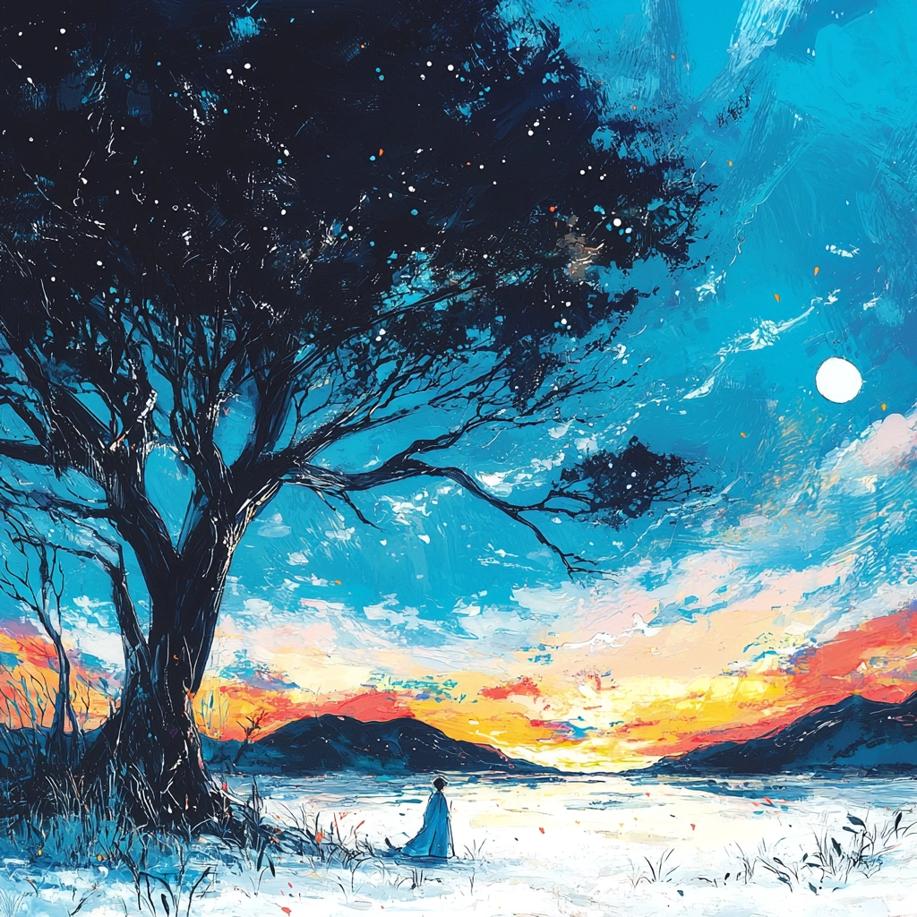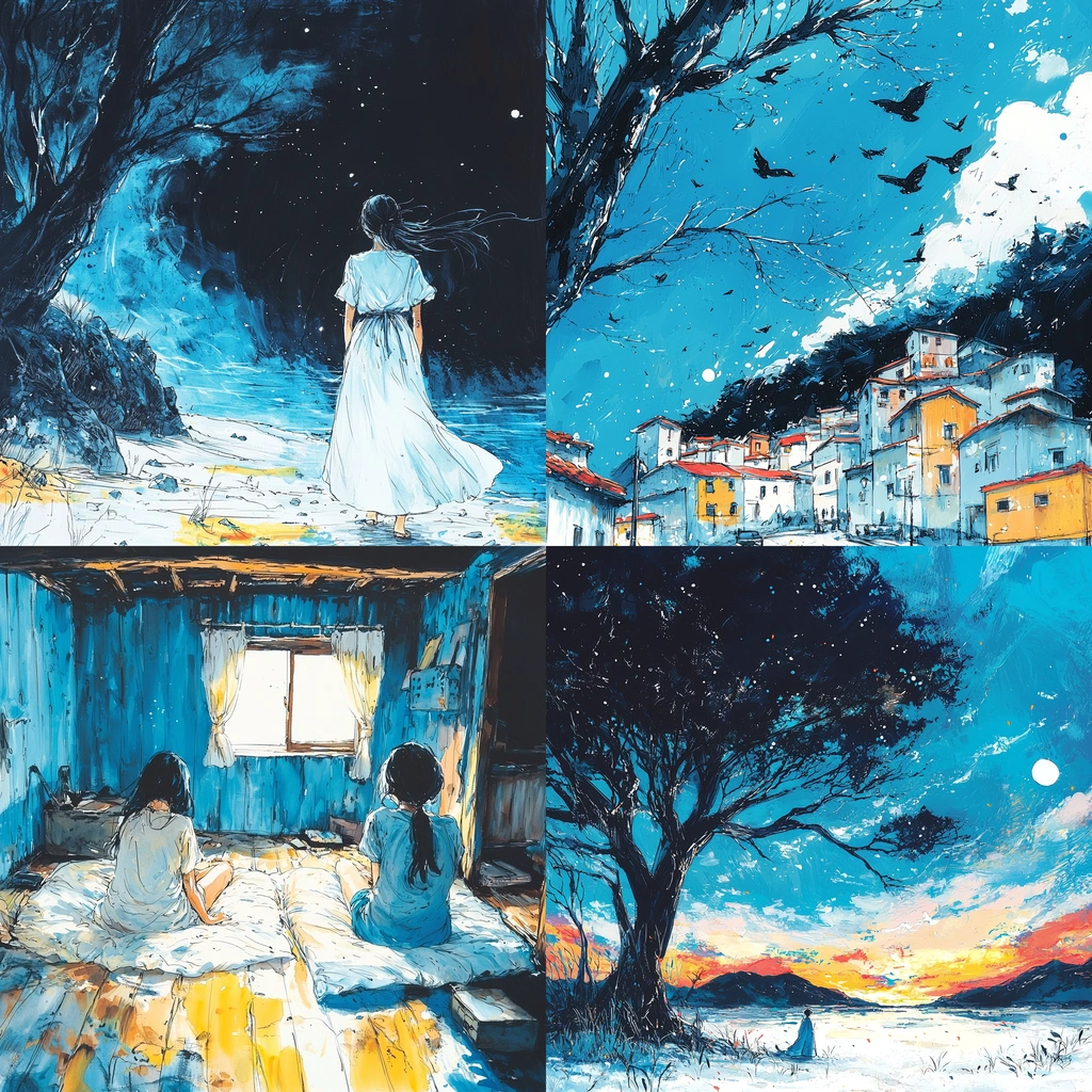 The lighting emphasizes stark contrasts between deep indigos and soft yellows, creating a vivid interplay of shadow and light. Textures are rough and expressive, with a sense of depth enhanced by layered brushstrokes.
