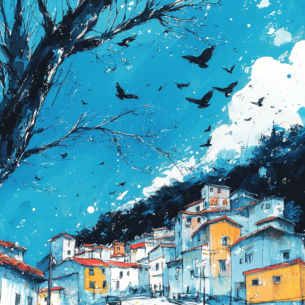 Richly layered with heavy contrast, blending vibrant blues and warm accents.