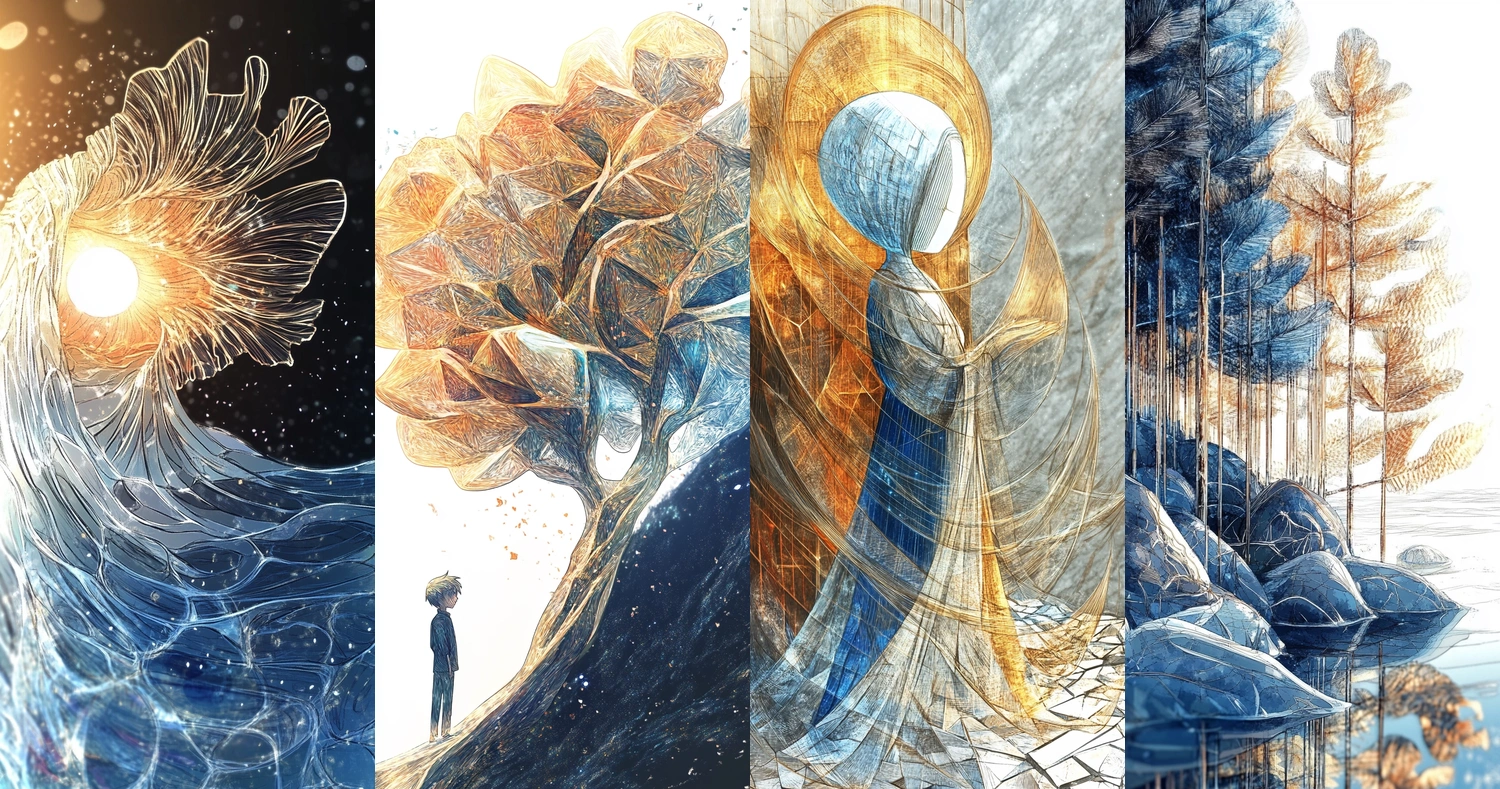 The lighting creates a luminous, almost tactile quality, accentuating the interplay between textured elements and vibrant, contrasting colors. The spatial arrangement utilizes overlapping forms, lending depth and movement.