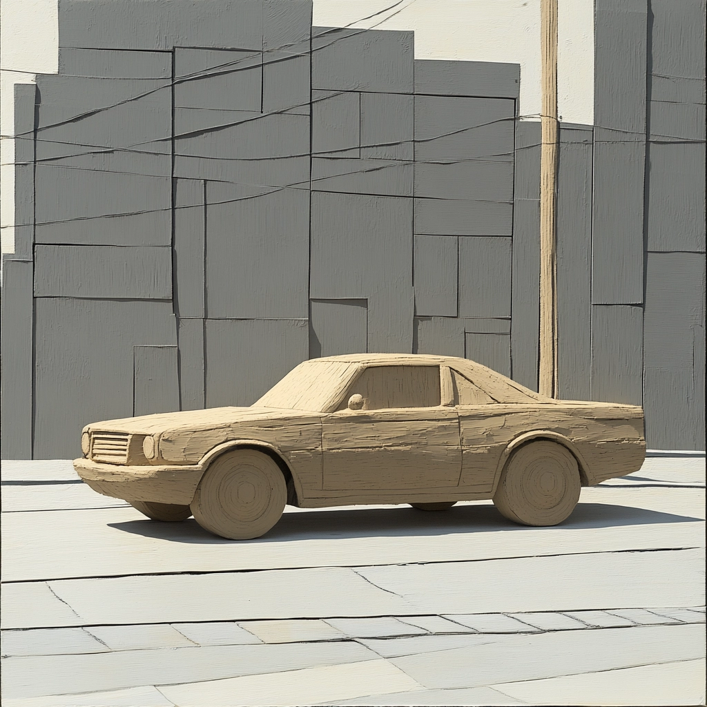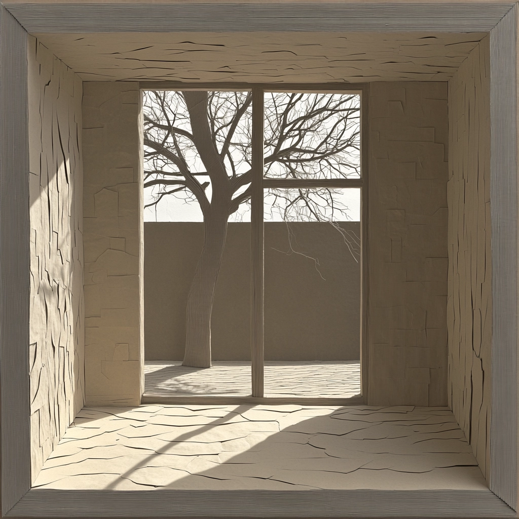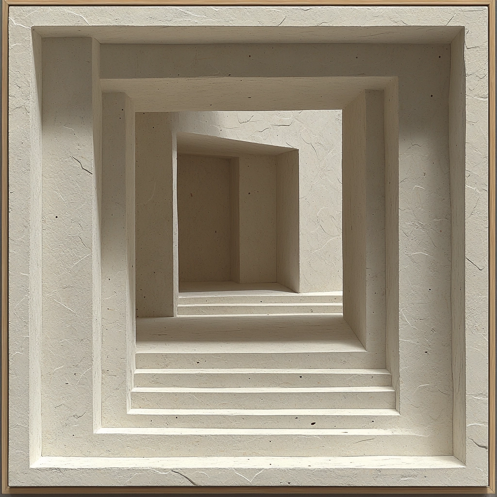 The lighting is natural, casting soft shadows that enhance the textured surfaces and the spatial depth. Beige and gray shades dominate, creating a monochrome effect with meticulous attention to texture, resulting in a realistic yet artfully composed scene. The use of symmetry and perspective establishes a structured and cohesive visual experience.
