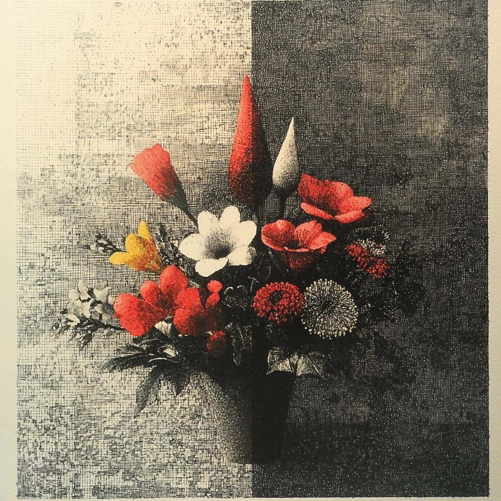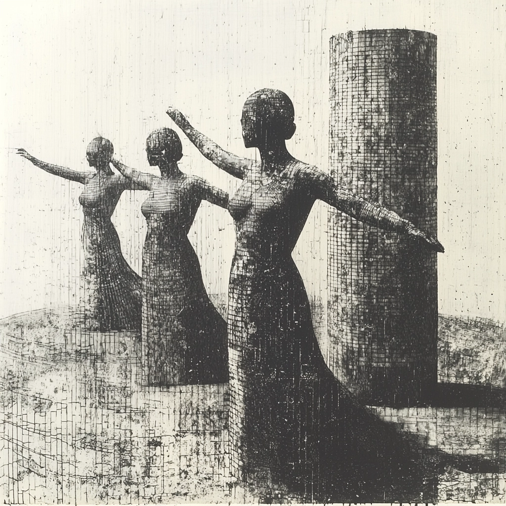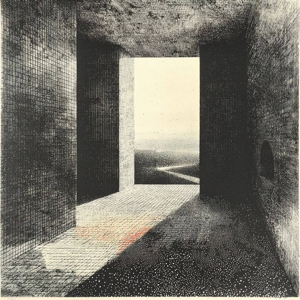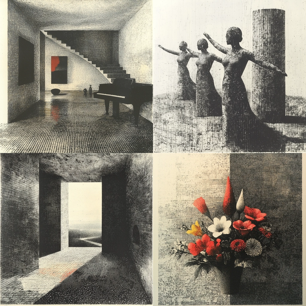 The artwork leverages chiaroscuro to create depth and a somber atmosphere, while intricate textures provide a tactile quality. Red accents are used sparingly to create focal points against a monochrome backdrop. Varying perspective and scale generate a dramatic sense of space.