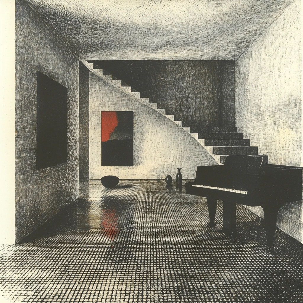 Uses grayscale textures with sharp red accents and distinct spatial planes.