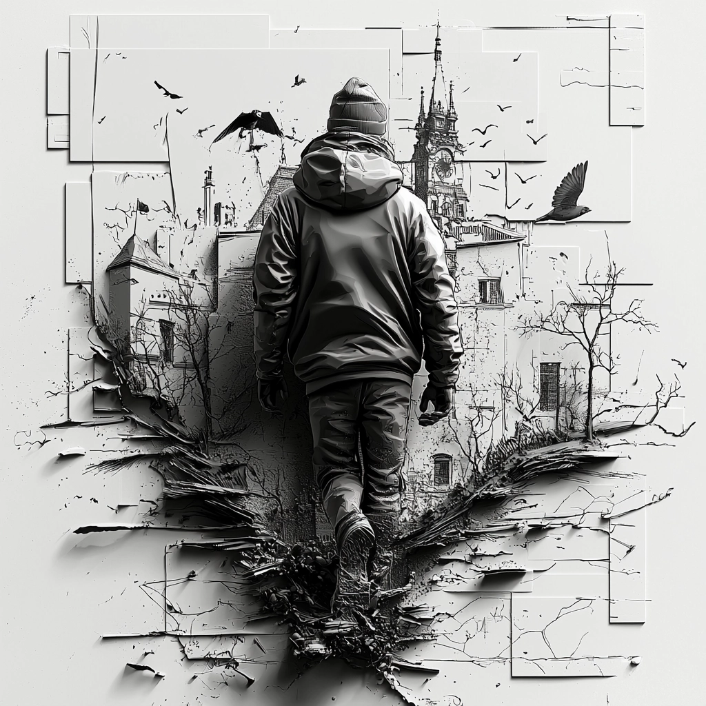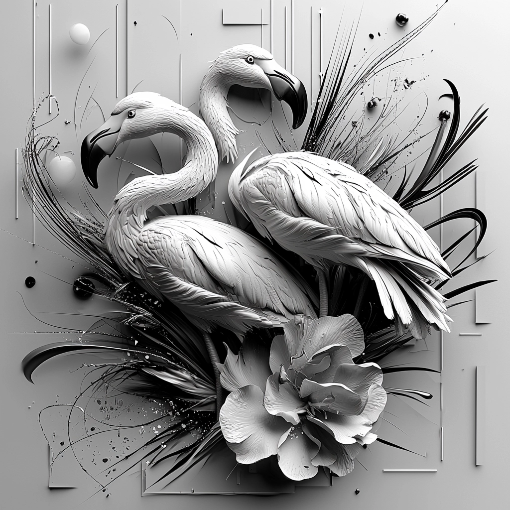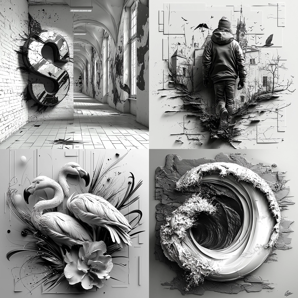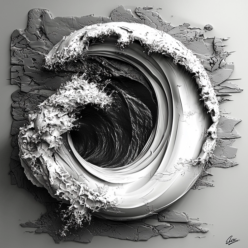 The use of monochrome colors emphasizes texture and depth, creating strong contrasts between light and shadow. This enhances the spatial perception, with a focus on detailed textural elements that suggest movement within static forms.