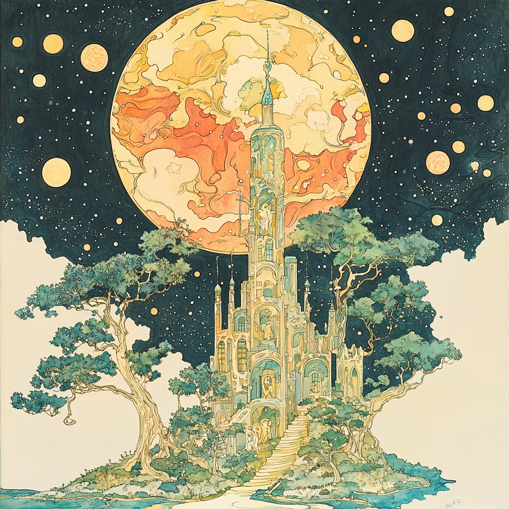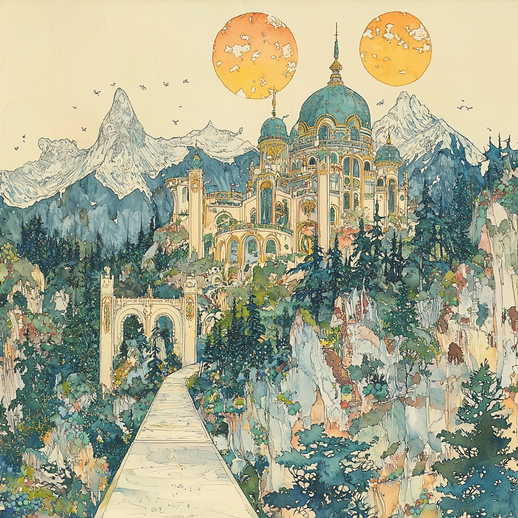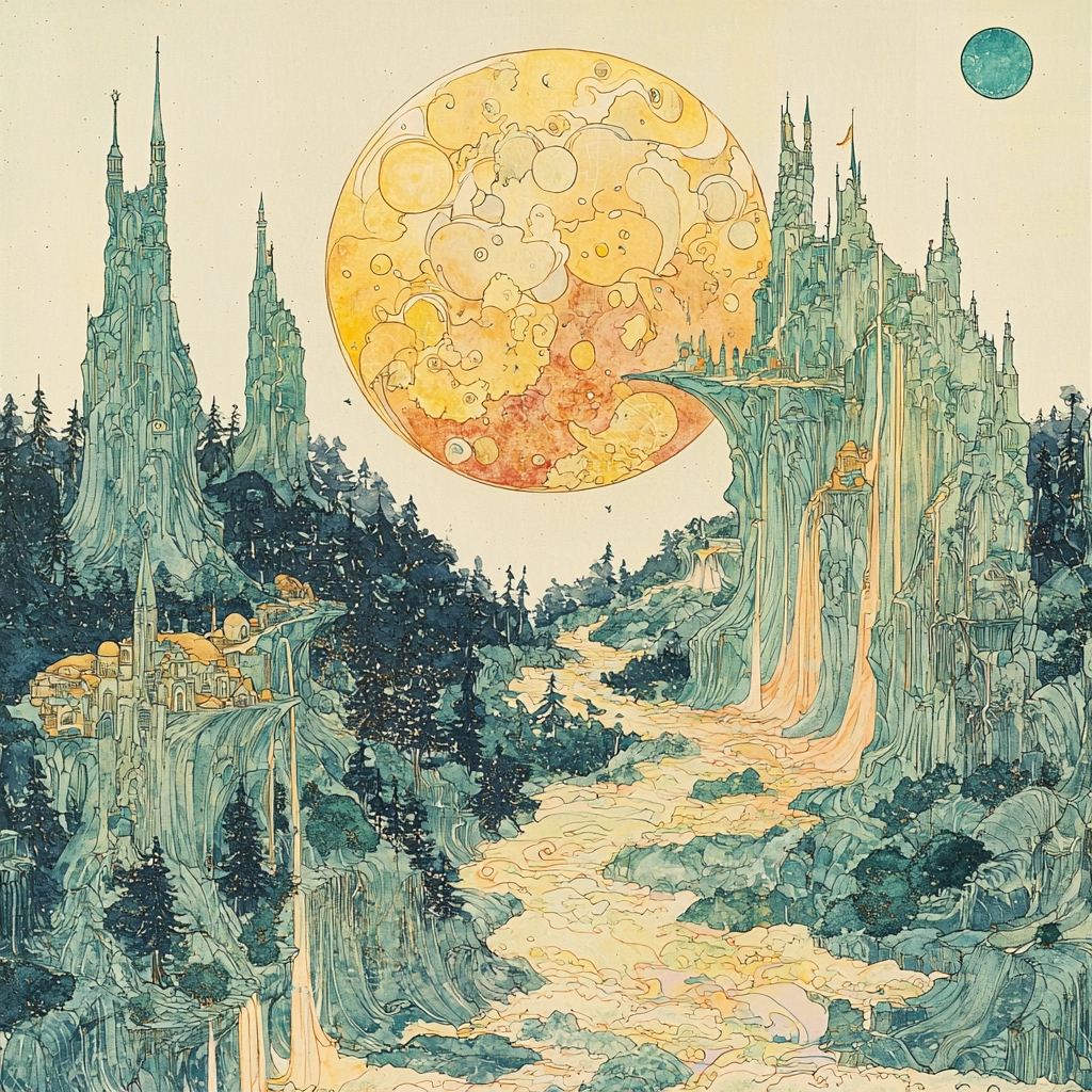 Combines intricate line work with celestial color schemes to create expansive landscapes.