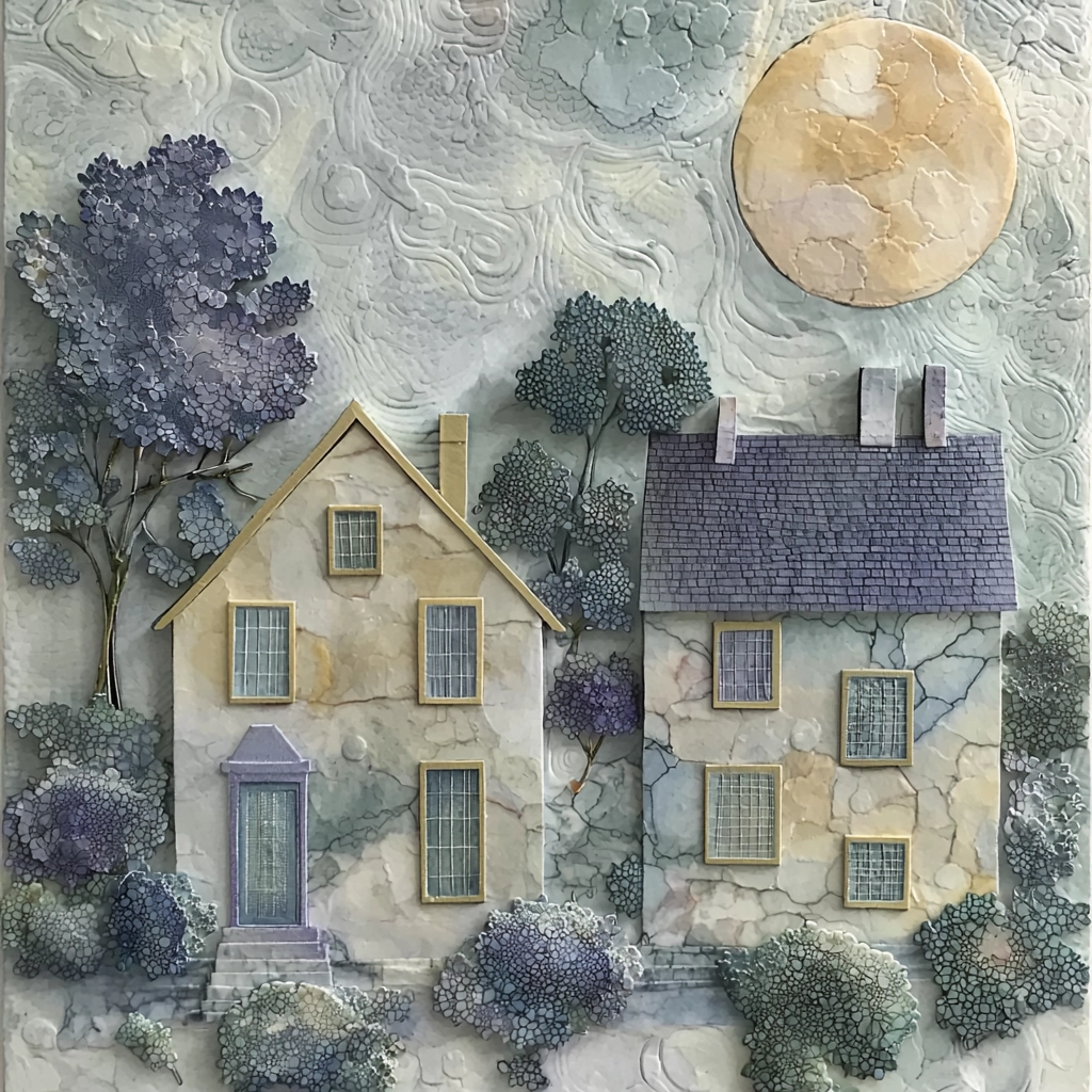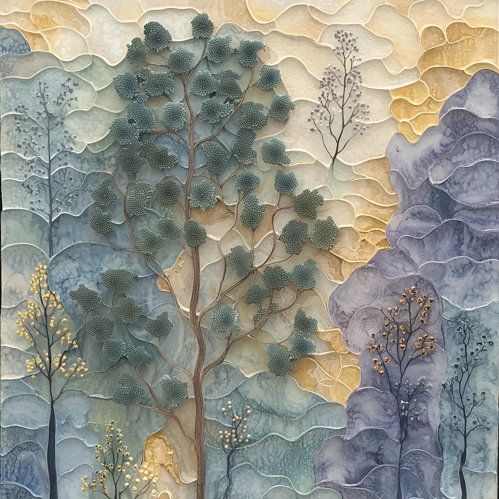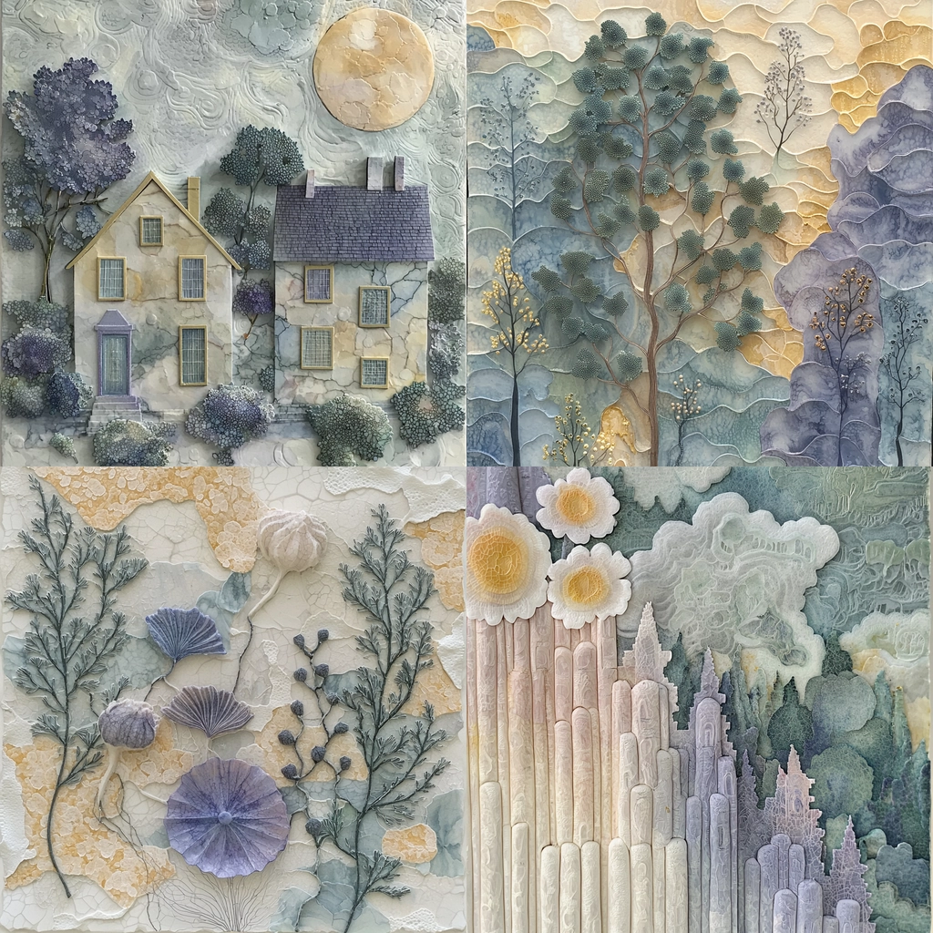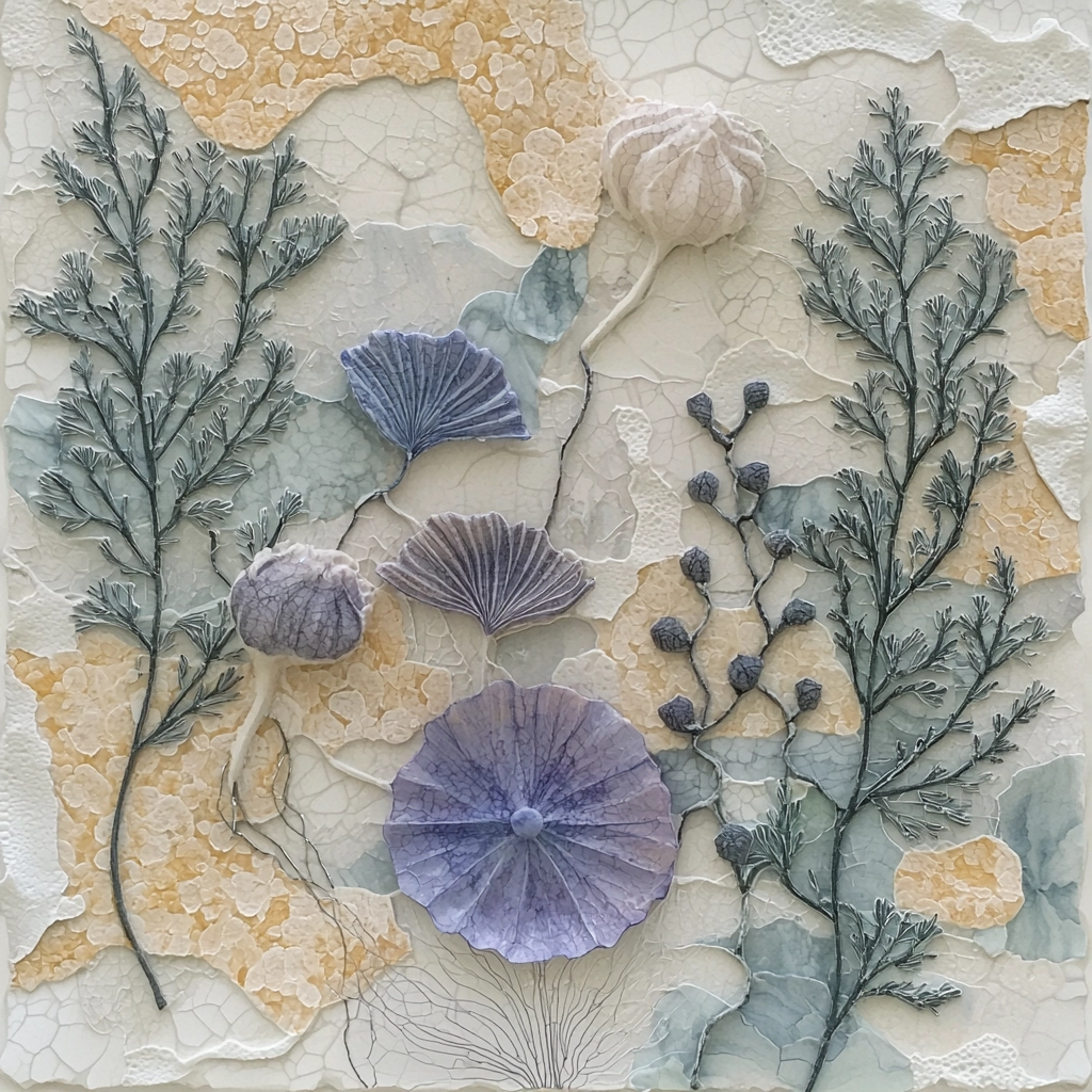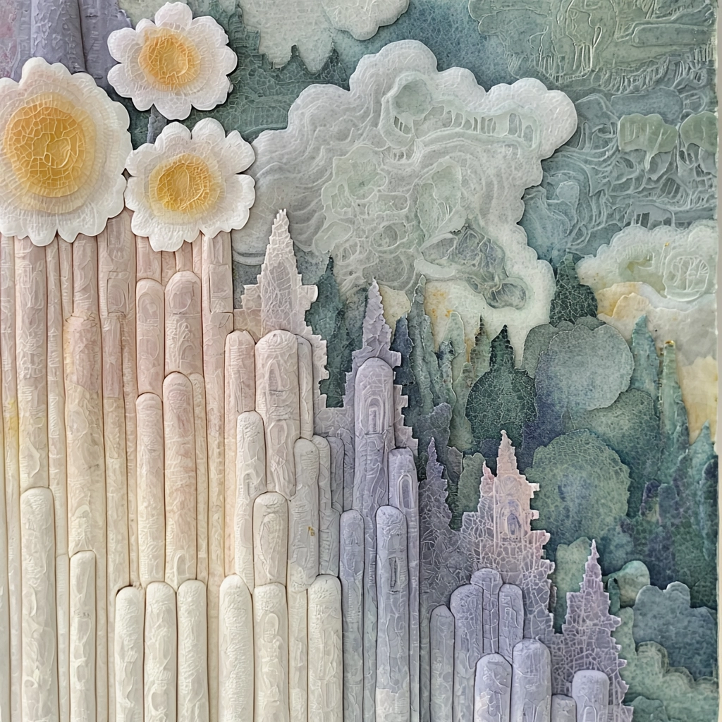 The use of delicate lighting enhances the subtle blend of pastel tones across the surface. Textures are intricately layered, producing a sense of gentle depth and tactile richness. Spatial arrangement appears balanced and intentionally structured.