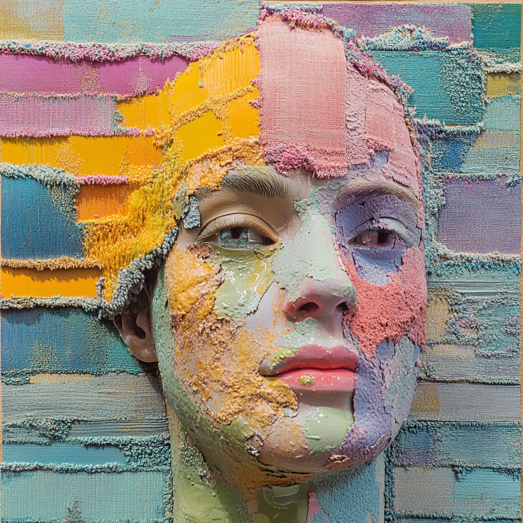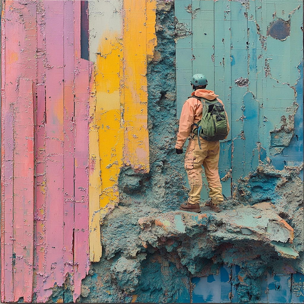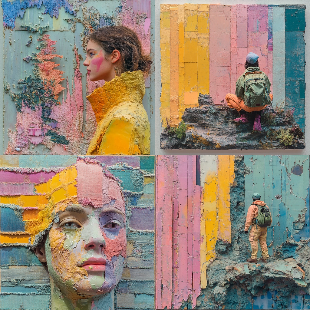 Lighting accentuates the interplay between rugged surfaces and smooth pastel tones. The sense of space is flattened yet enriched with tactile textures, offering contrasting planes and varying roughness in their expression.