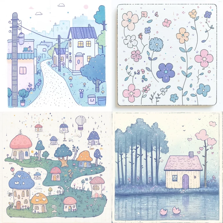 The dynamic lighting enhances the textures, creating a vivid, multi-dimensional effect. The use of color is bold and varied, with geometric precision in spatial arrangement. Each piece appears as an intricate mosaic with richly developed layers.