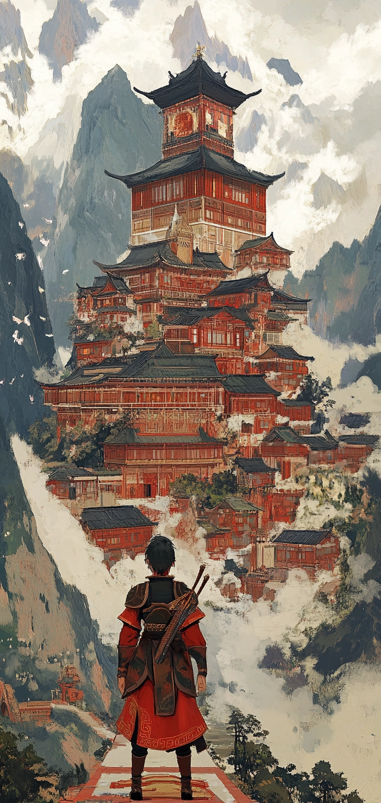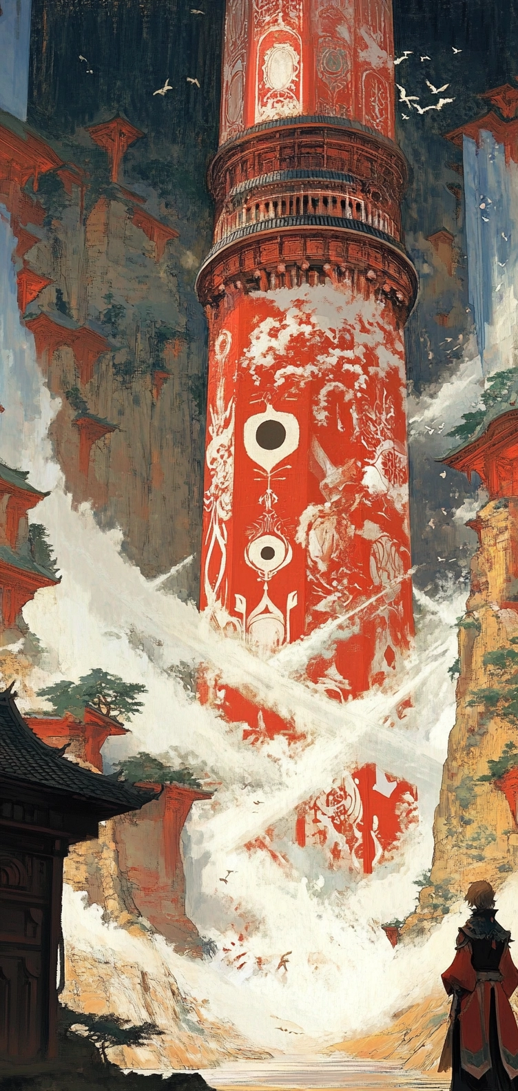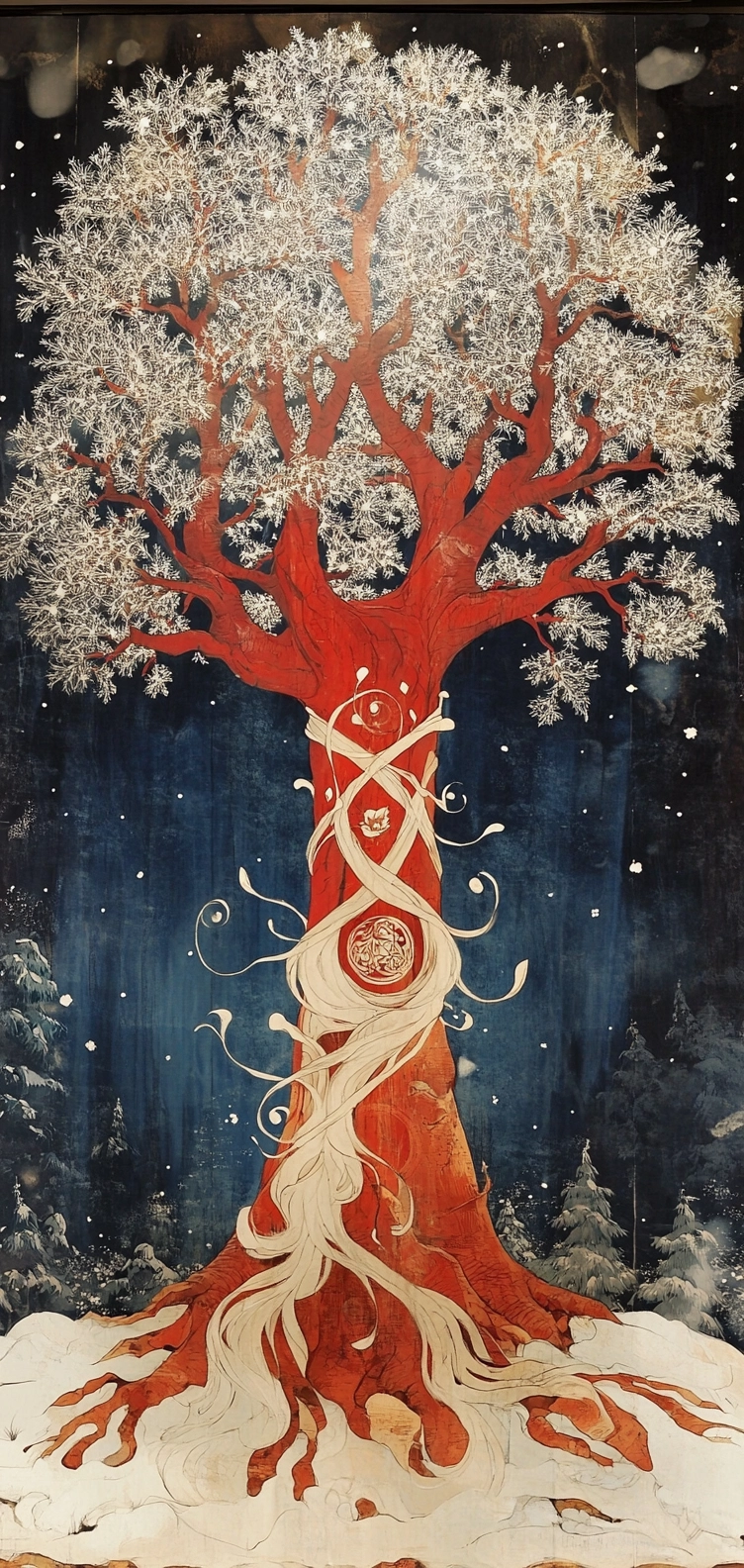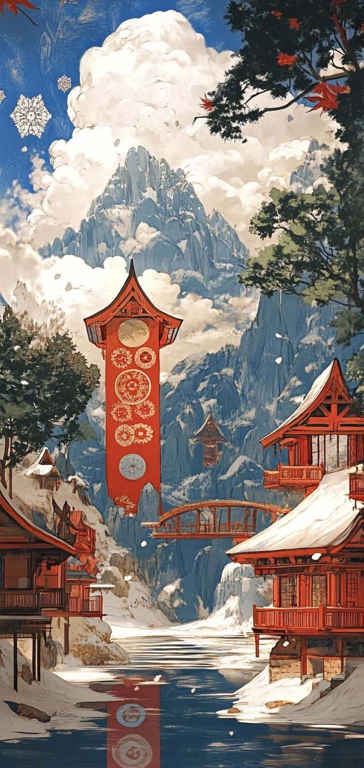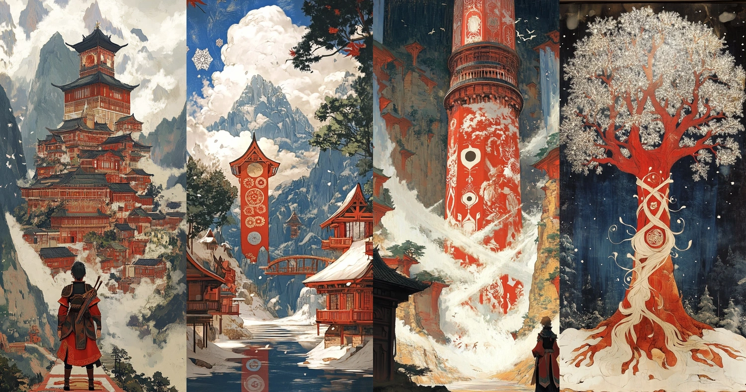 Rich reds and cool blues against a backdrop of white accents, creating a vibrant landscape with intricate details.