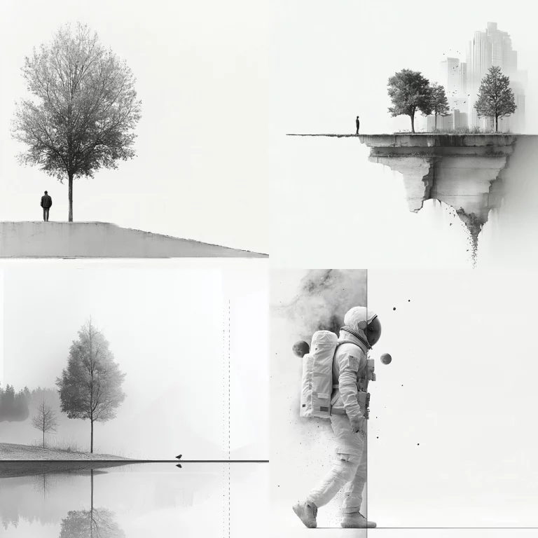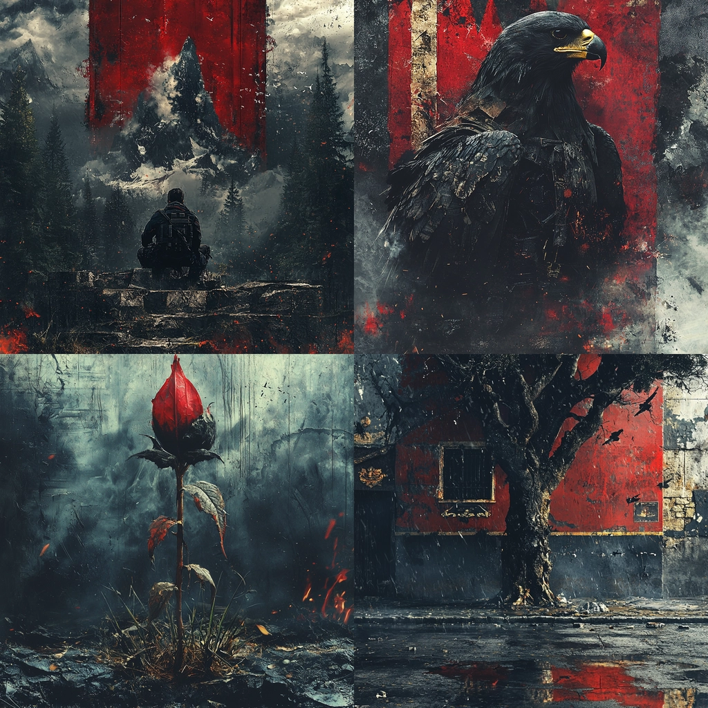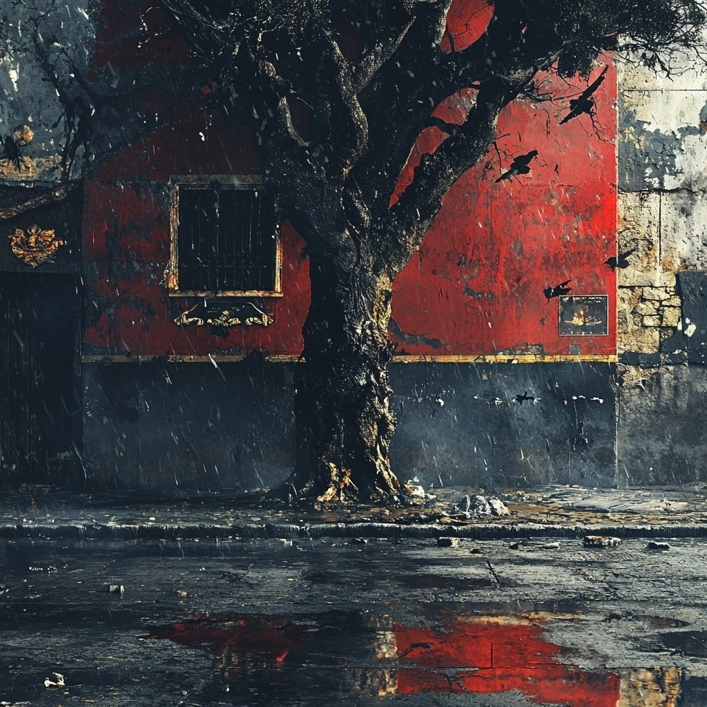 The textures within the imagery offer a palpable depth, with rough, gritty surfaces that engage the senses. Red utilizes bold shadows and highlights, deepening contrast against the muted, varied tones of gray. Spatial depth is conveyed through layered detailing and perspective shifts, enhancing complexity.