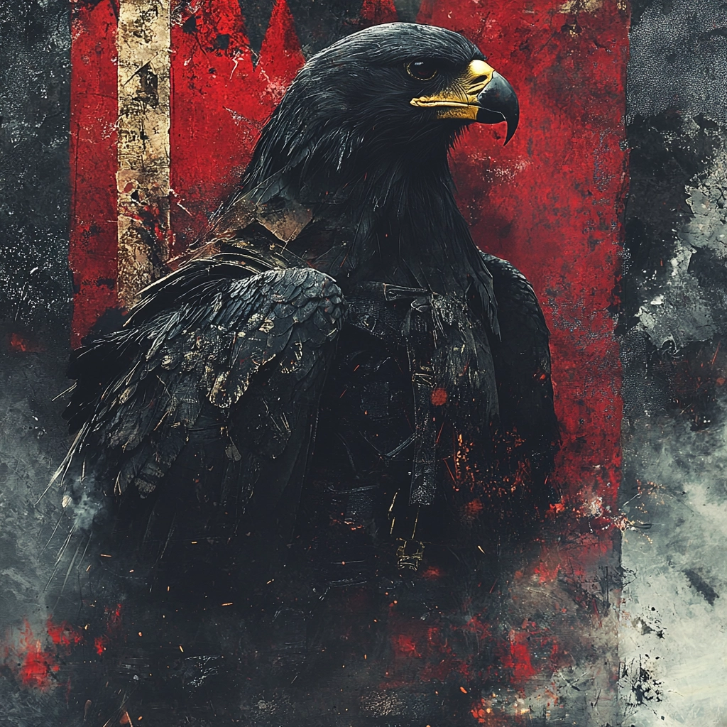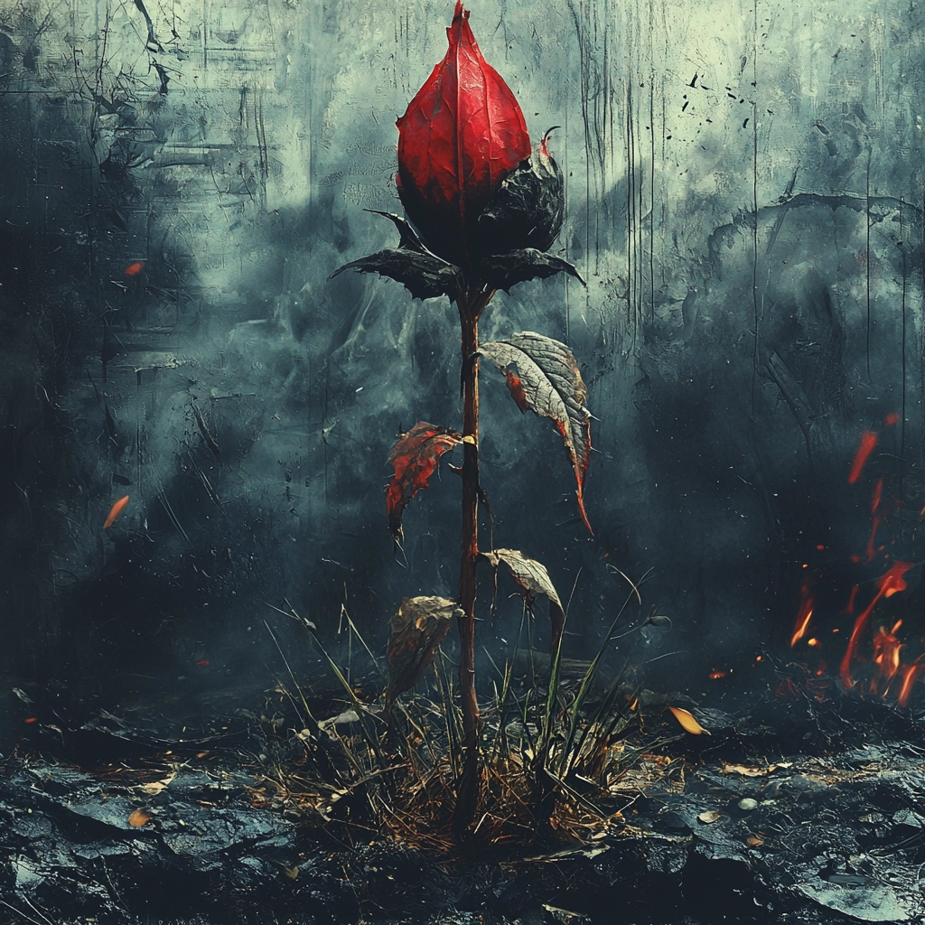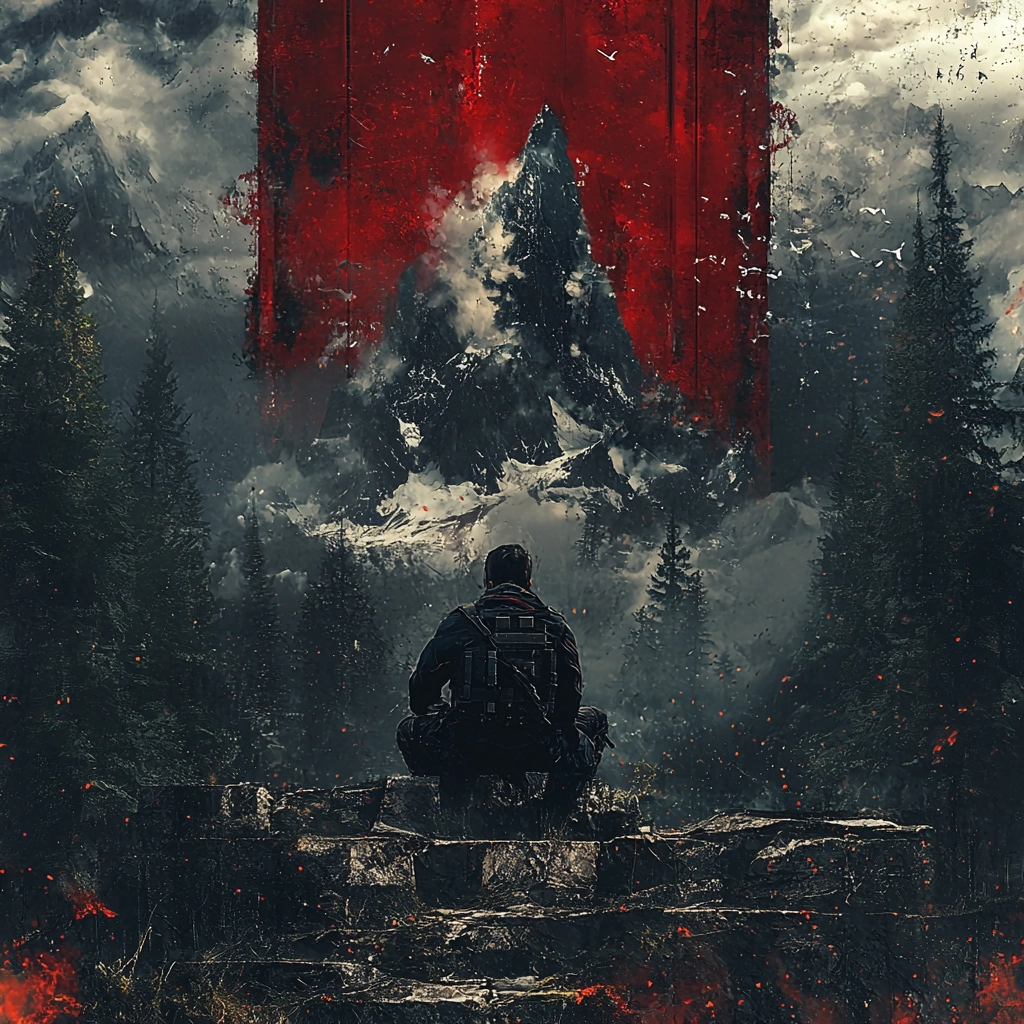 The composition utilizes bold red elements that contrast against a gray backdrop, creating a dynamic and intense visual balance.