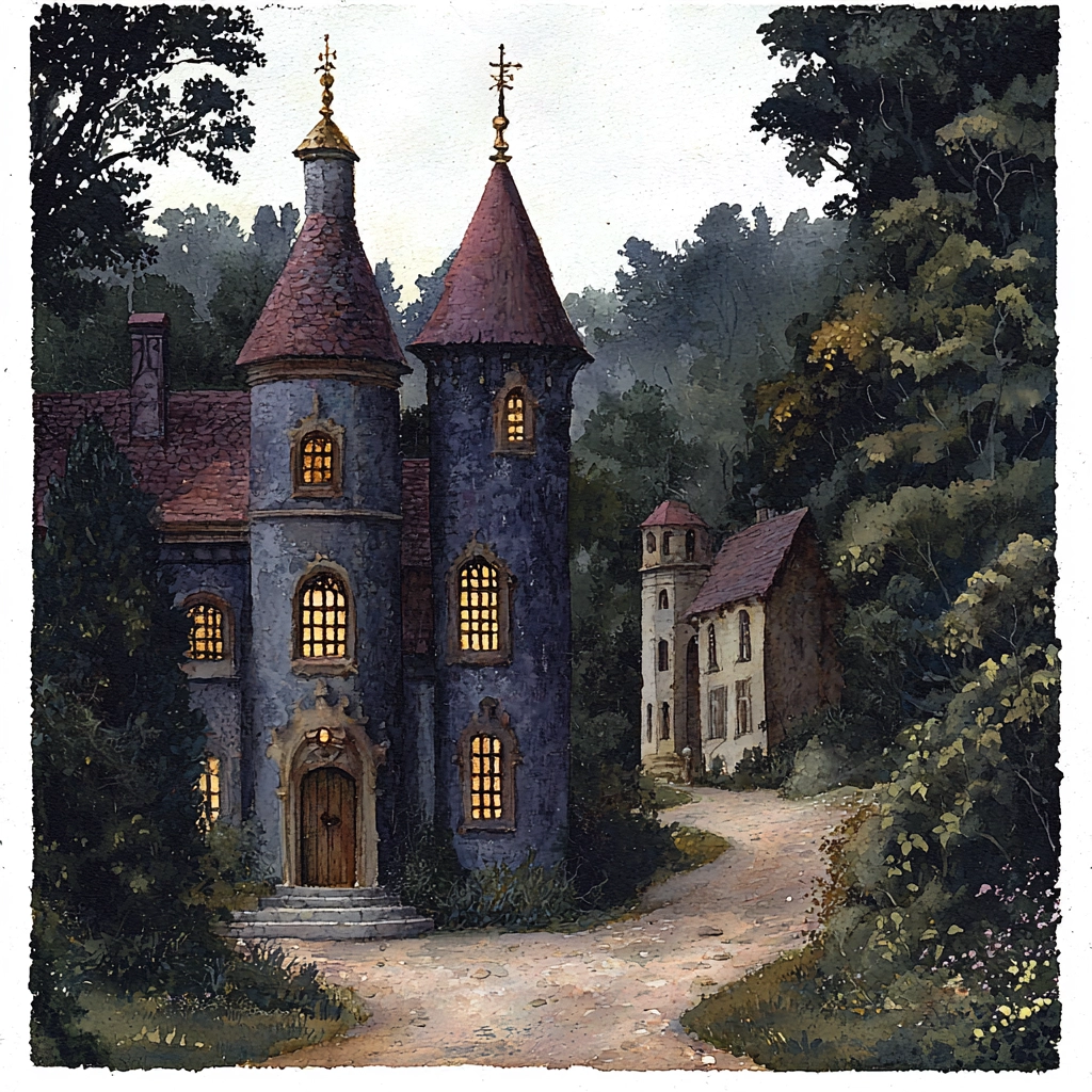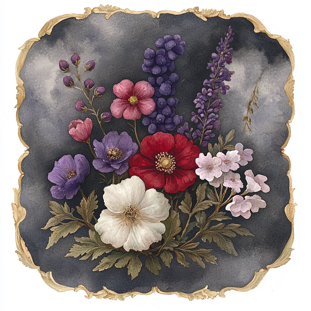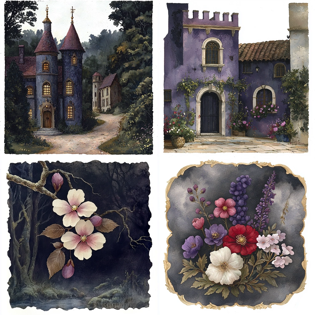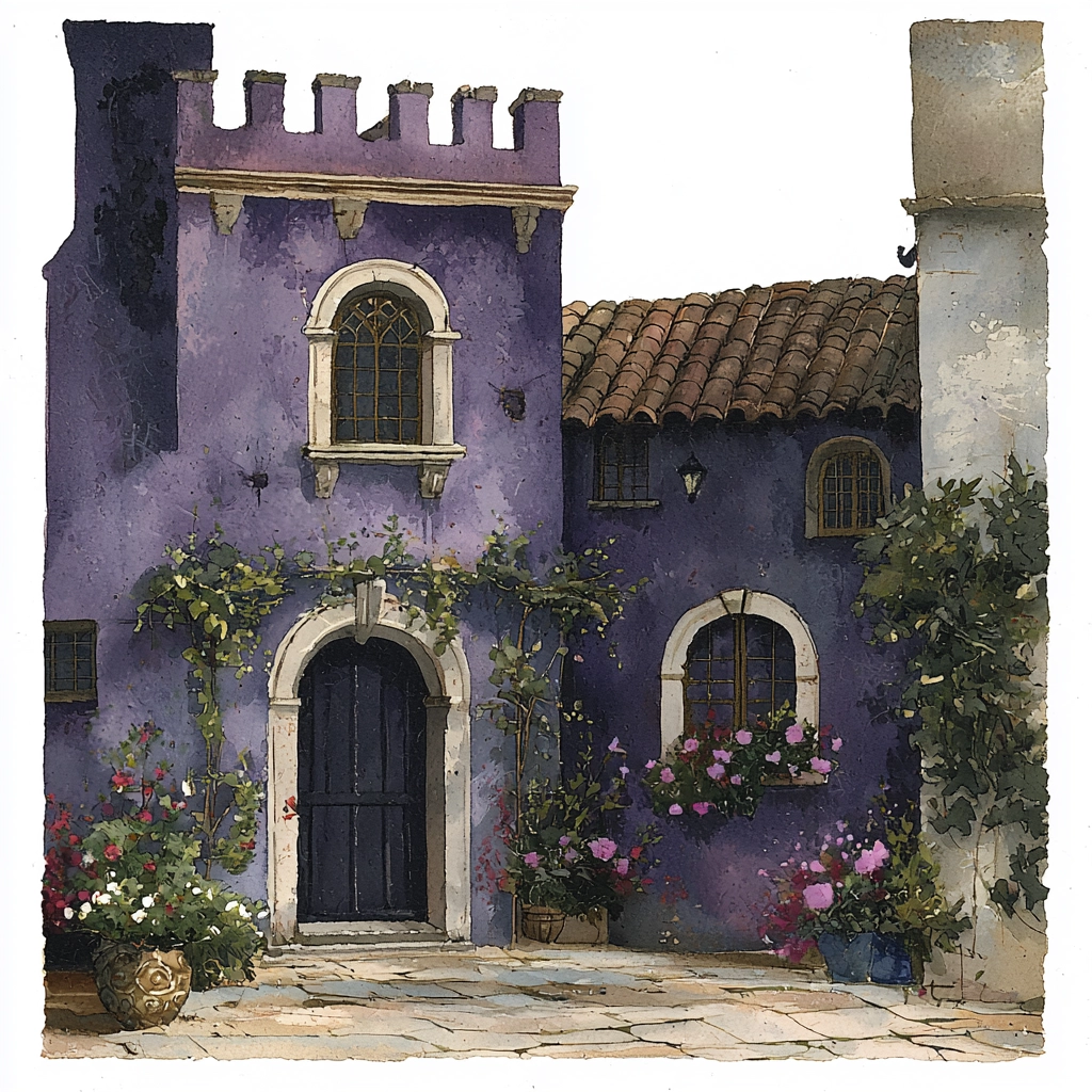 Involves intricate lighting portraying a sense of depth; bold purple hues combined with brown and gray create stark contrasts; fine texture expressed through detailed brushwork evokes a tactile quality.