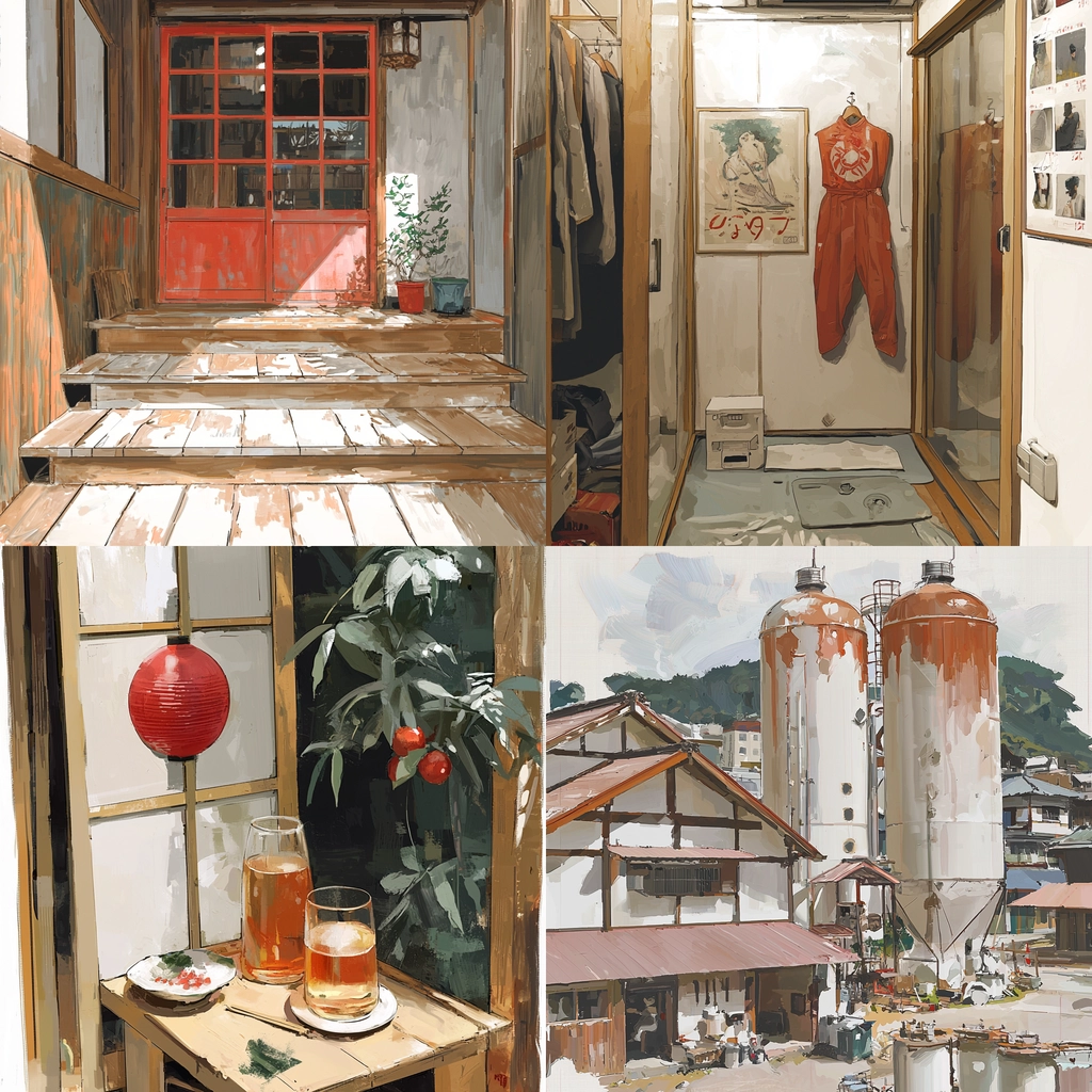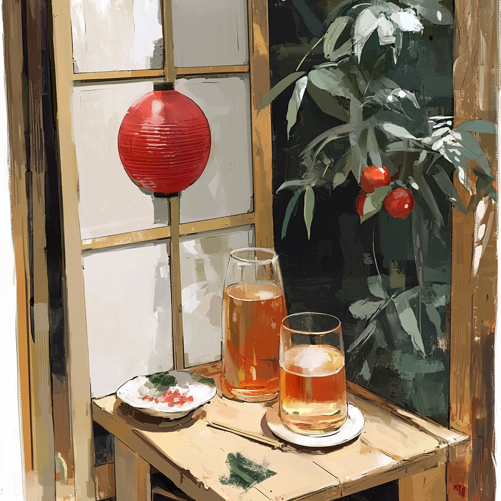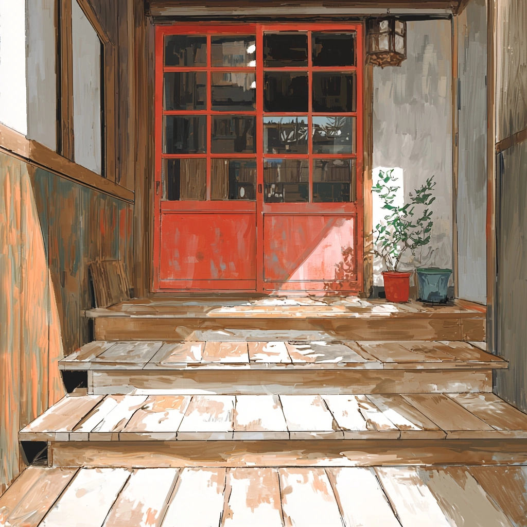 The lighting is soft, creating warm highlights and subtle shadows across surfaces. Browns and reds stand out in the color palette, while textures are richly detailed, imparting a tactile quality. A gentle spatial depth is achieved through layered composition and perspective.