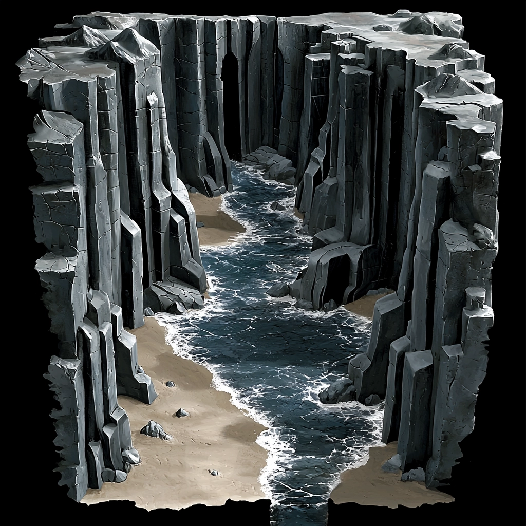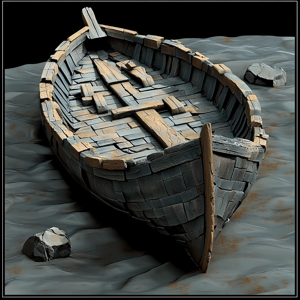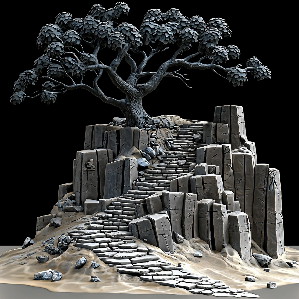 The lighting emphasizes form through soft shadows that define stone edges and surface irregularities, while color remains restrained with cool grays balanced by warm beige and touches of dark blue. Surfaces present a tactile, rough texture resembling weathered stone or wood, and spatial depth is achieved through clear perspective lines and layered placement of elements with precise edge definition.