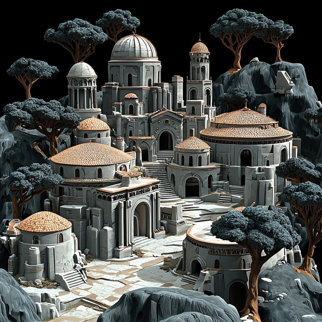 Detailed stone textures combined with muted beige tones and soft natural light create structured compositions with clear depth and layered spatial arrangement.