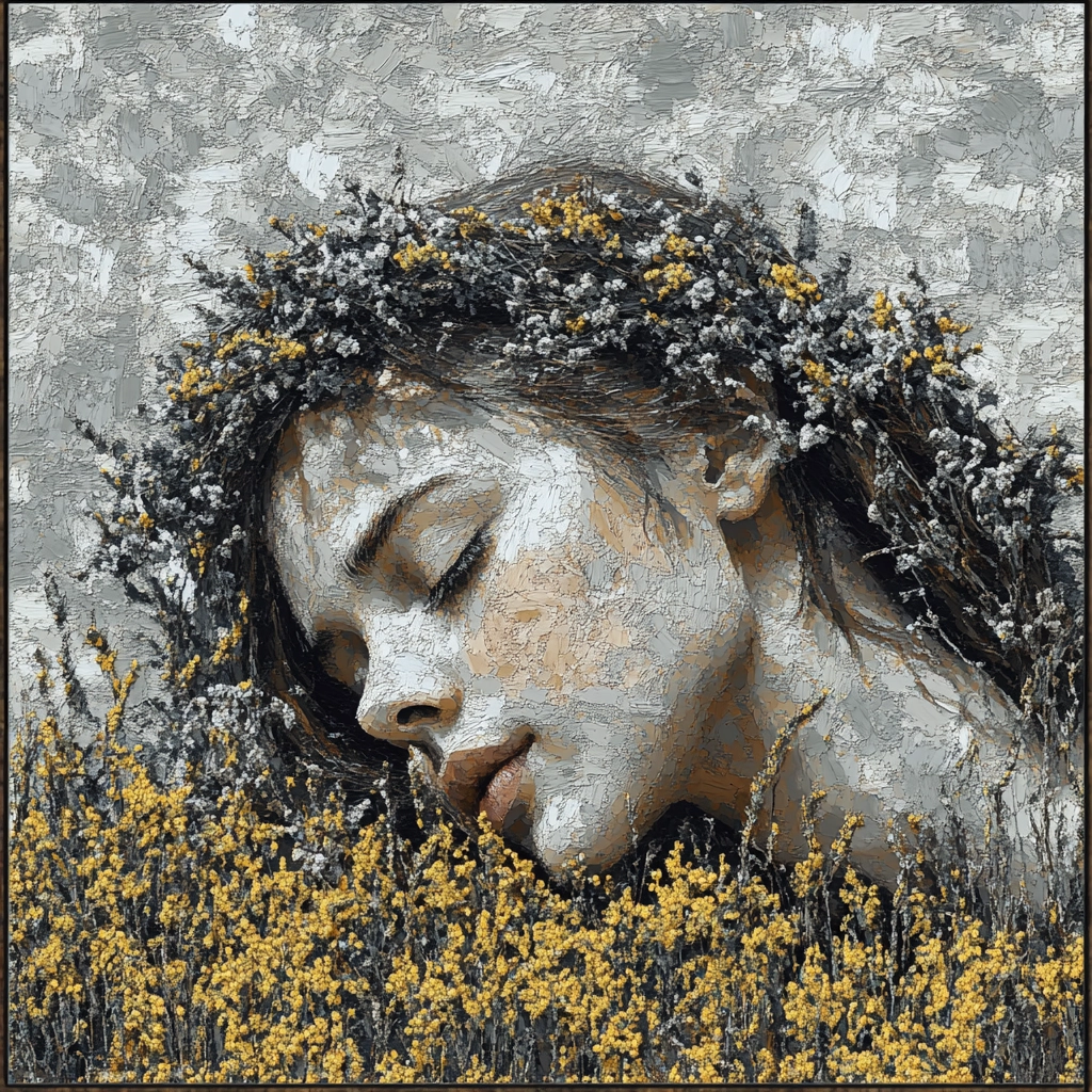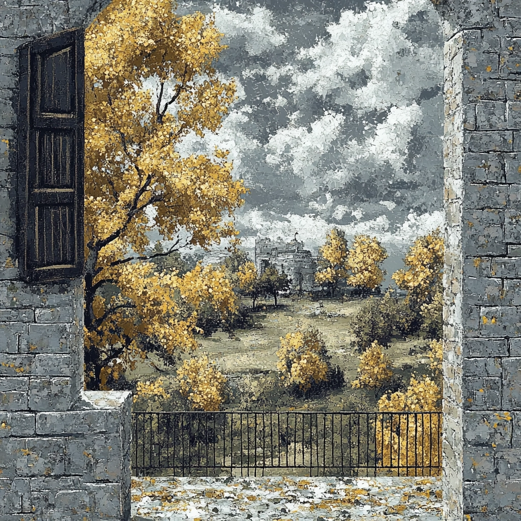 Lighting creates a dramatic effect by highlighting textured stone surfaces against vivid yellow foliage. Spatial complexity arises from juxtaposed sections of brushy softness and meticulously defined stone patterns, providing depth while maintaining an organic flow.