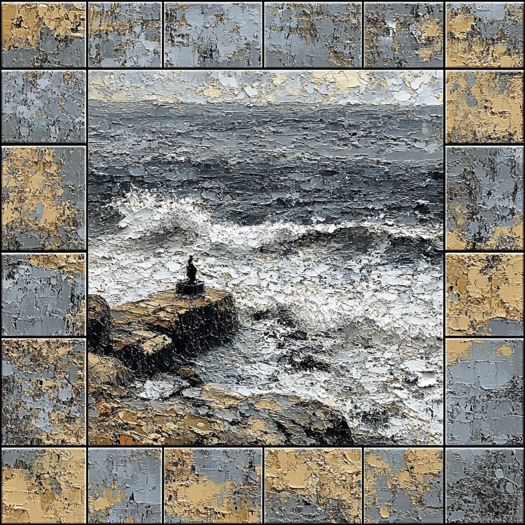 Gray tones with splashes of yellow form textured stonework scenes featuring soft brushwork.