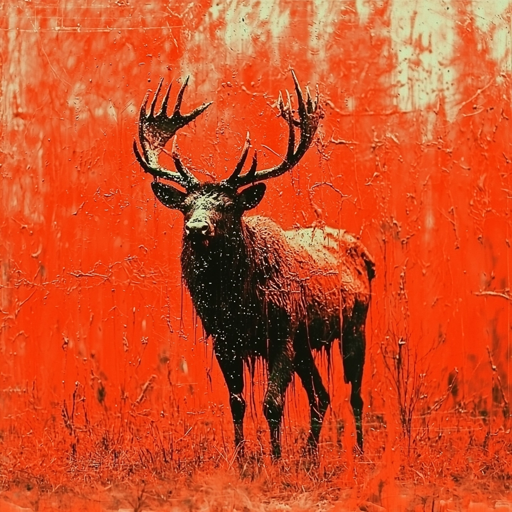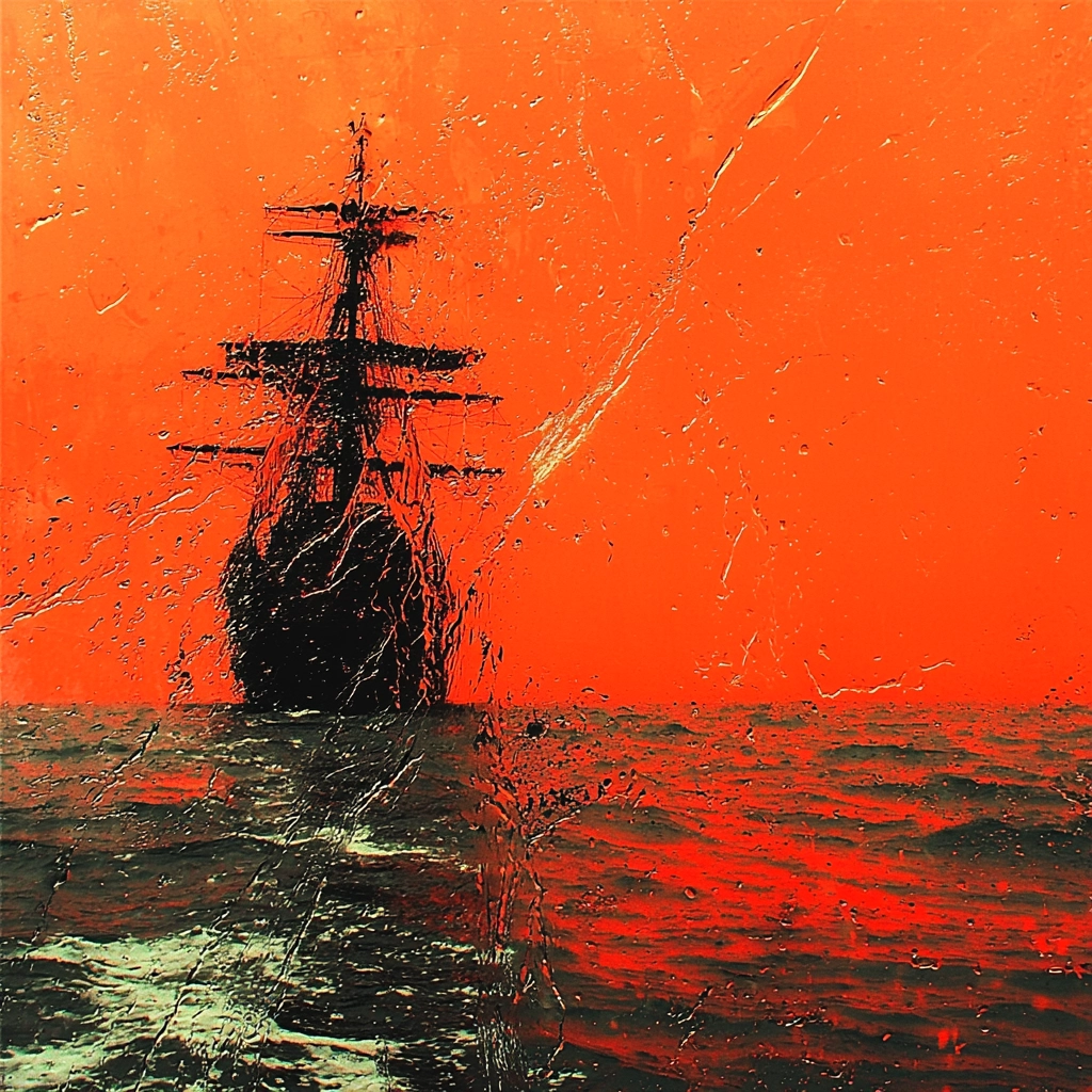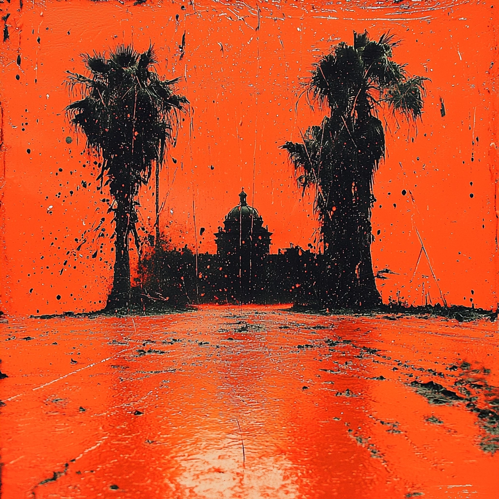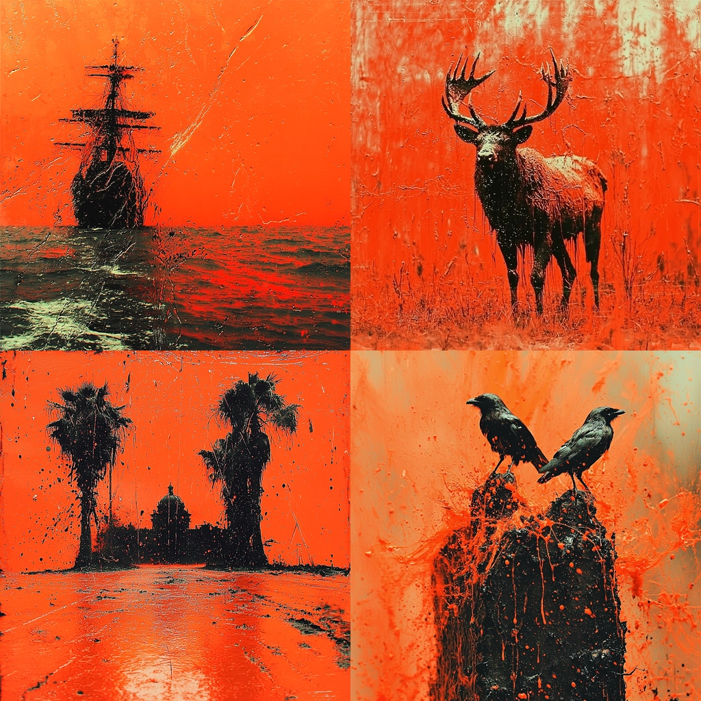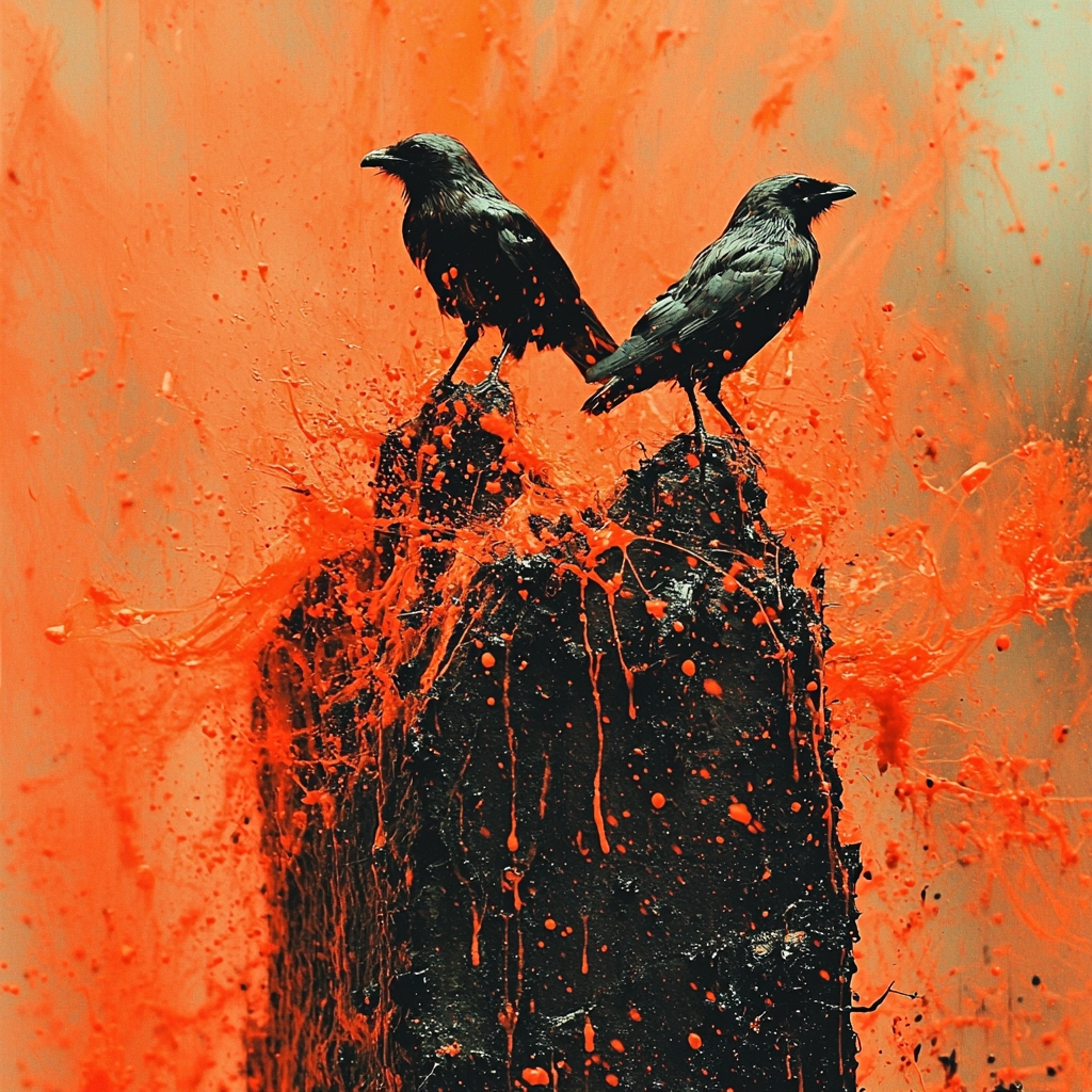 Lighting enhances sharp contrasts against deep black silhouettes. The radiant orange fills the space, giving a vibrant and intense backdrop. Textural expressions are bold, with heightened visual drama through pronounced surface effects.