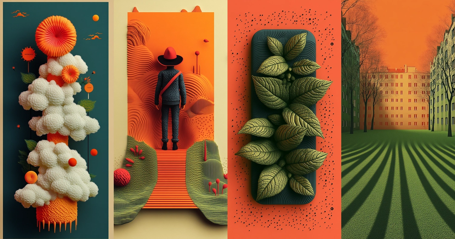 The lighting is soft, enhancing the textures' tactile quality and vivid colors. The sense of space is clearly defined with a strong emphasis on surface details, showcasing intricate textures and bold color contrasts.