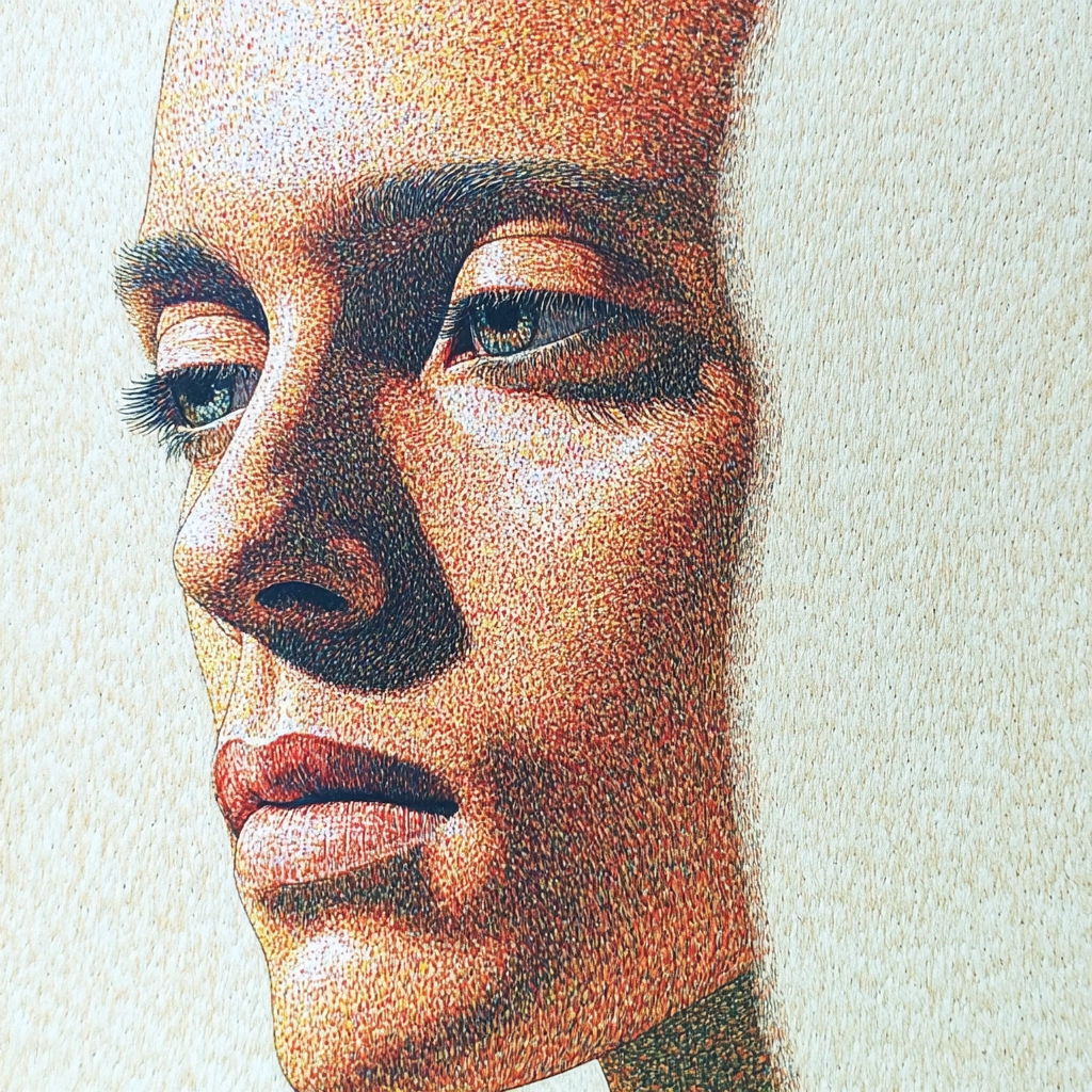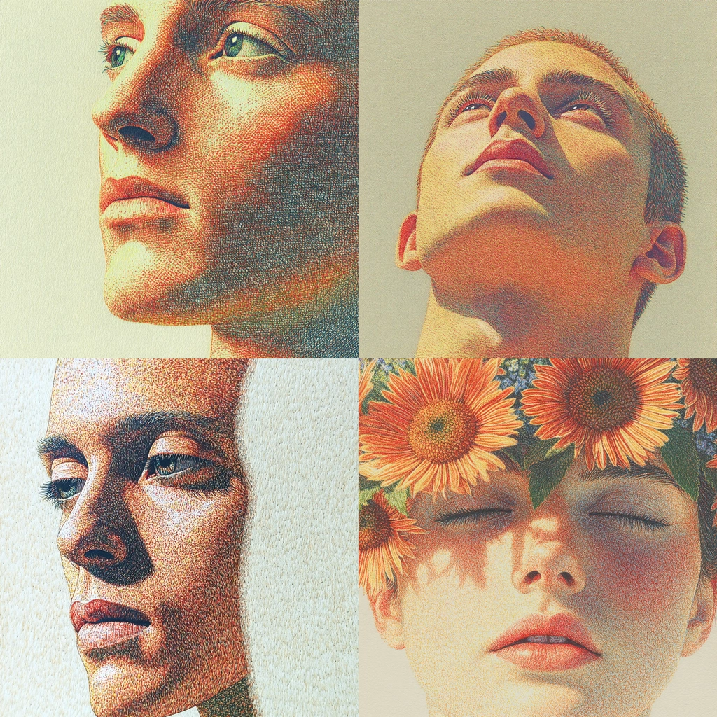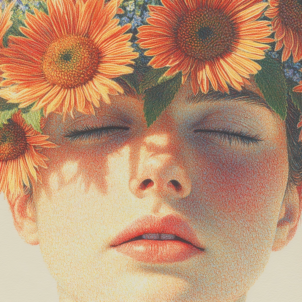 The use of warm tones like beige and orange alongside green creates a soothing effect. Individual textures and detailed patterns add depth and visual interest, with a modern aesthetic sensibility.