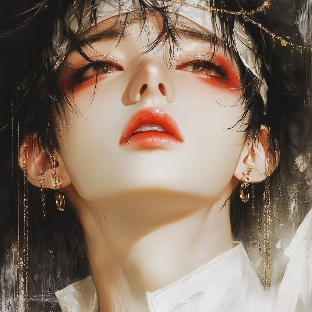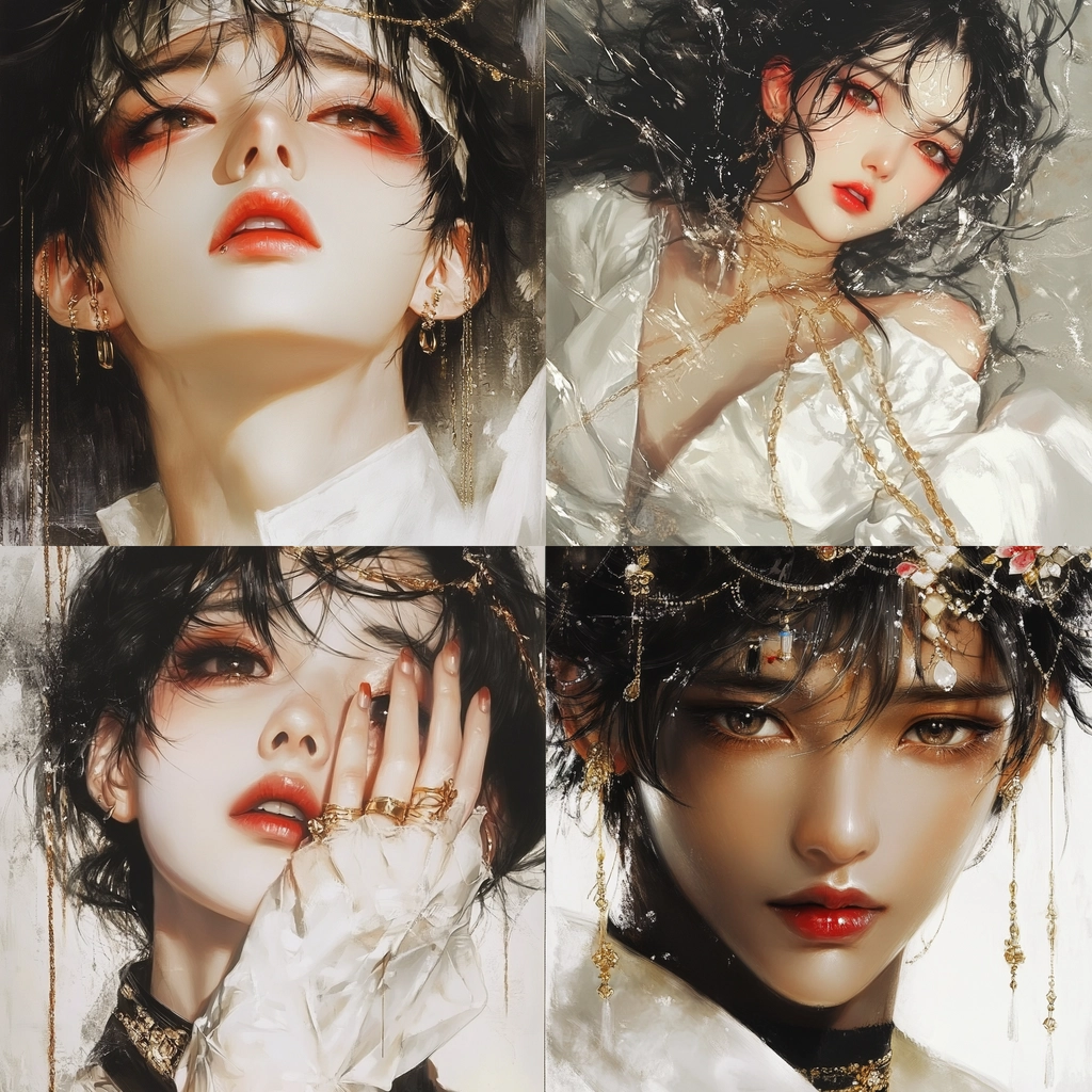 The use of reflective white fabric set against dark hairstyles creates a striking visual tension.
