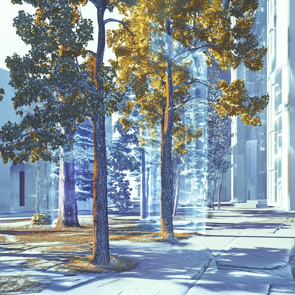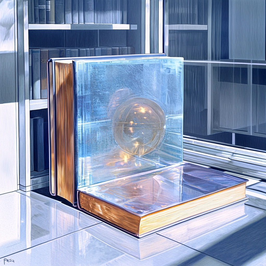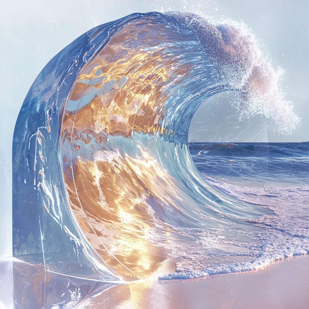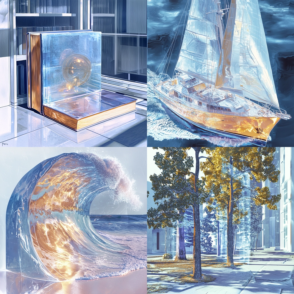 Lighting plays a significant role in creating a sense of translucency, with cool blue shades contrasting against warm golden hues. The sense of depth is enhanced by sharply defined lines and reflective surfaces, lending a highly polished texture to the scenes.