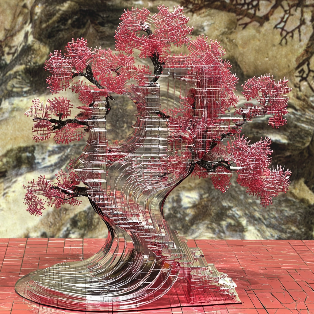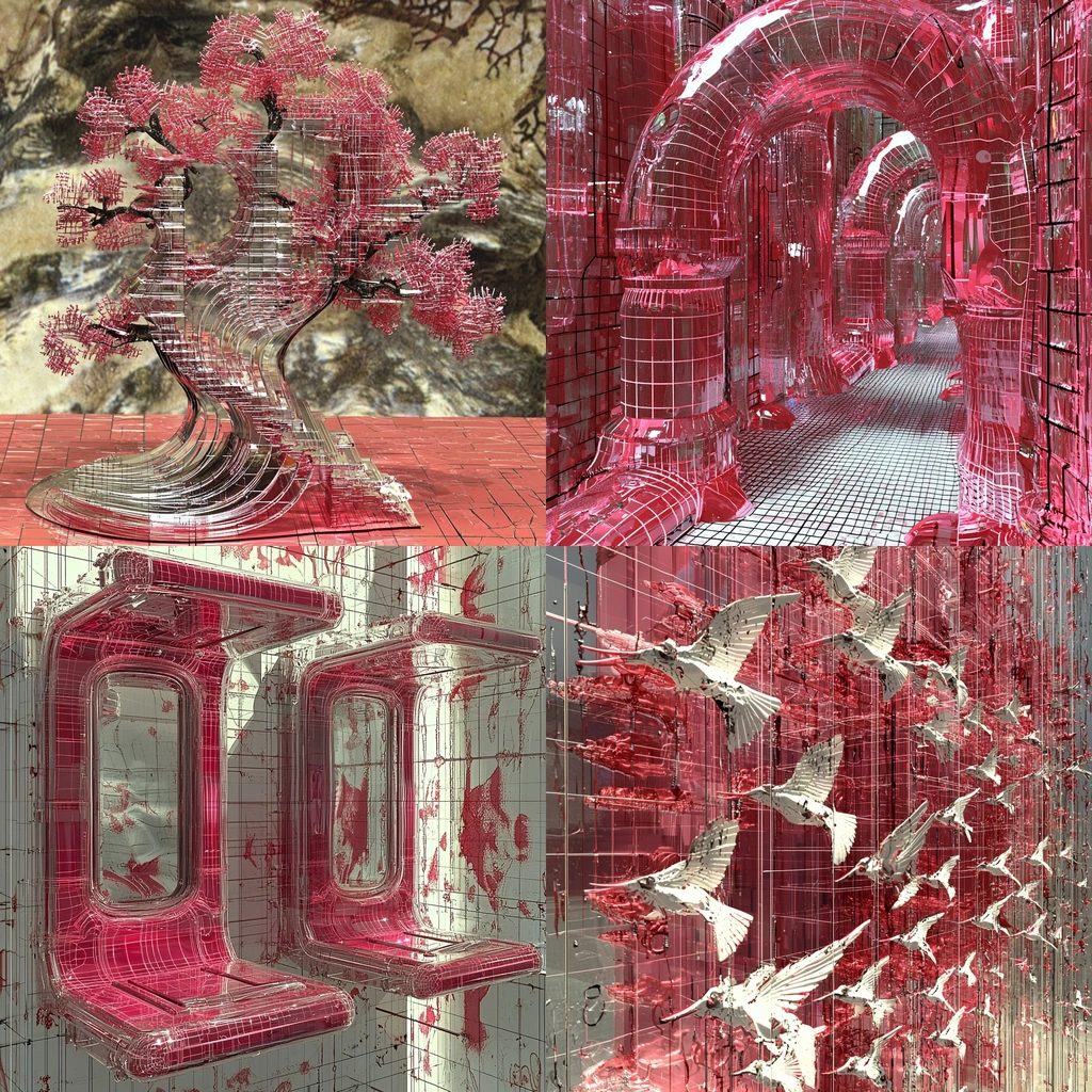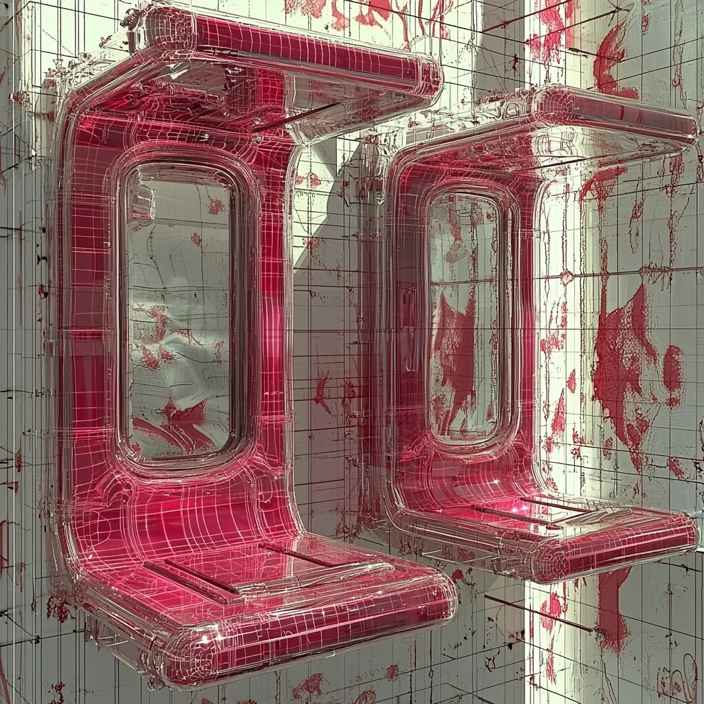 An intricate interplay of transparent forms and geometric structures accentuated by vivid pink and subtle beige tones.