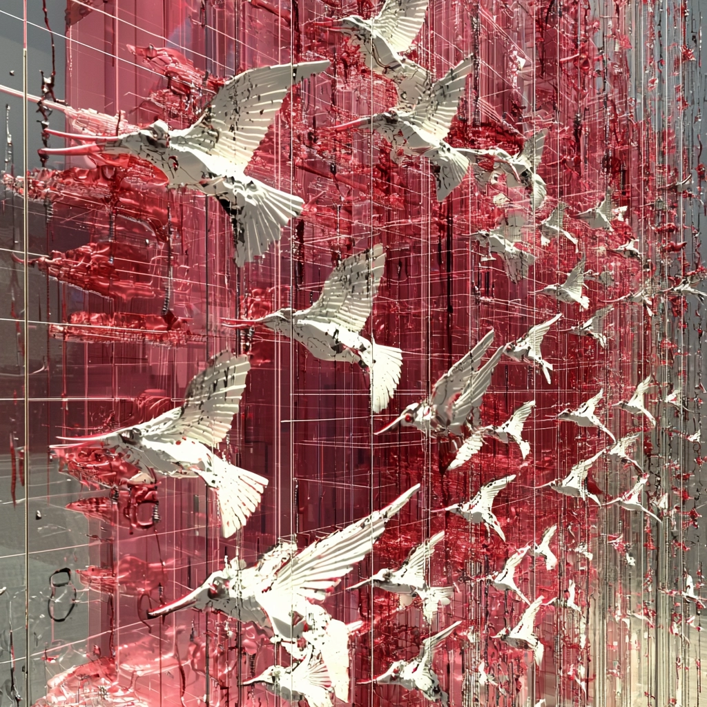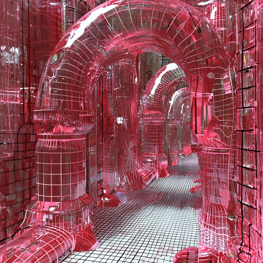 The use of grid-like structures enhances spatial perception, with light reflecting off the transparent surfaces to create illusions of depth. The texture appears almost liquid, bringing a sense of fluid movement. The precise lines intersecting with curvilinear forms result in a balanced yet dynamic composition.