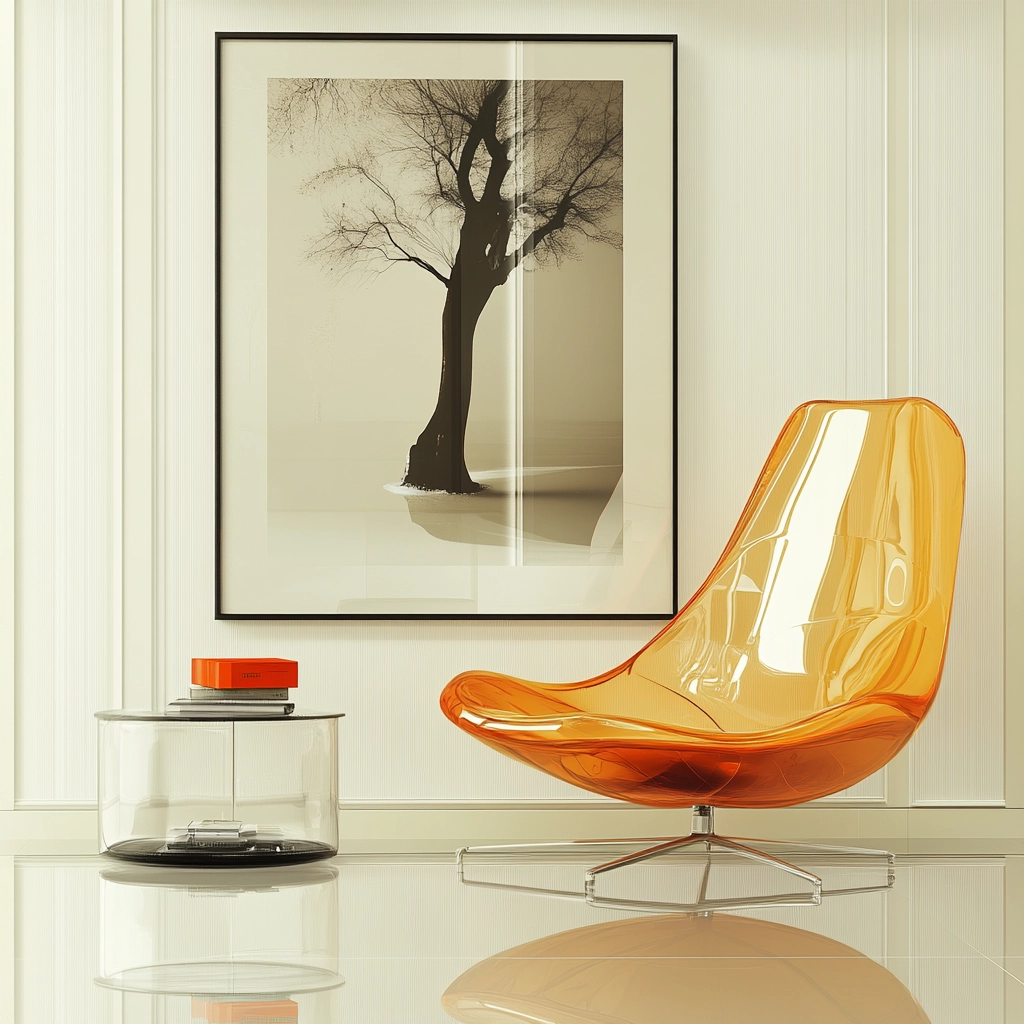 The lighting creates a sense of depth with soft reflections and glossy textures, emphasizing the interaction between light and materials. The color scheme combines vibrant oranges with muted beige tones, generating a harmonious yet striking visual effect. Spatially, elements are organized to create a balance between openness and confined modern architectural elements.