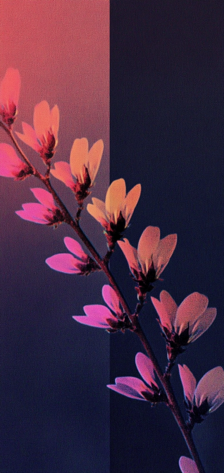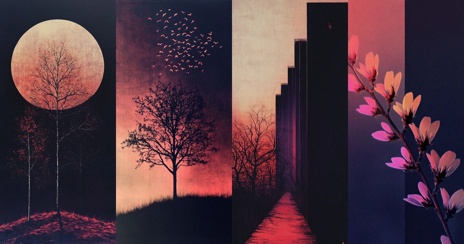 A blend of dark backgrounds with glowing highlights in red and pink hues.