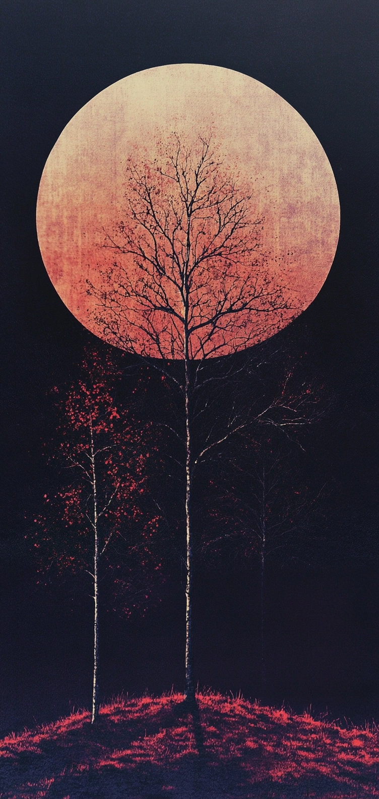 The lighting effects create a strong contrast between the dark and illuminated areas. The red and pink colors are vivid, with smooth transitions and gradients. Spatial depth is conveyed through the positioning of elements from foreground to background, with textures ranging from fine lines to soft edges.