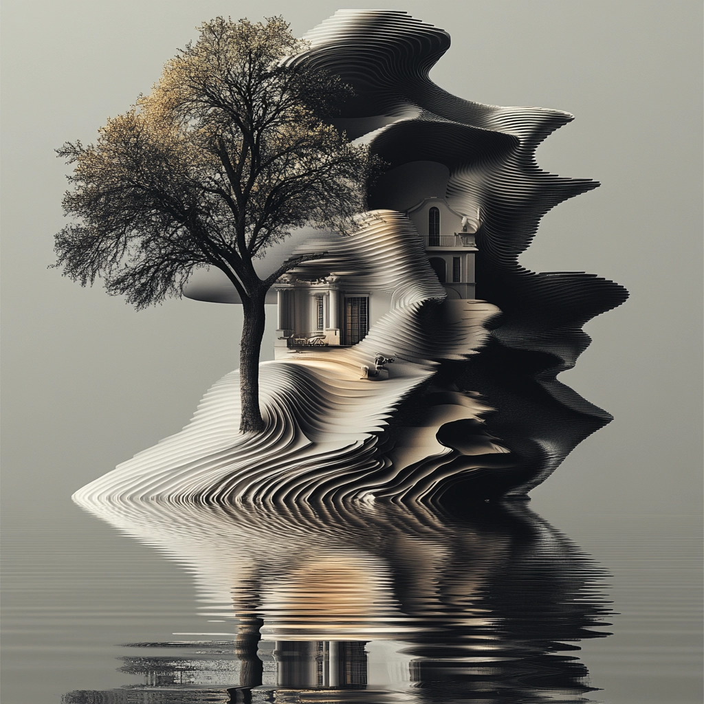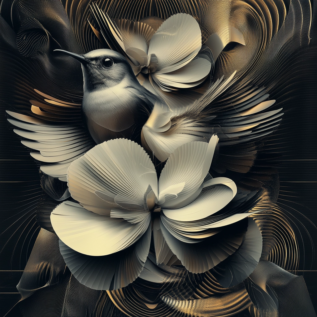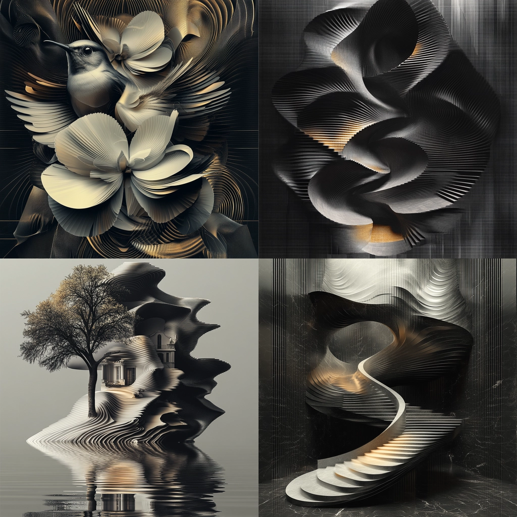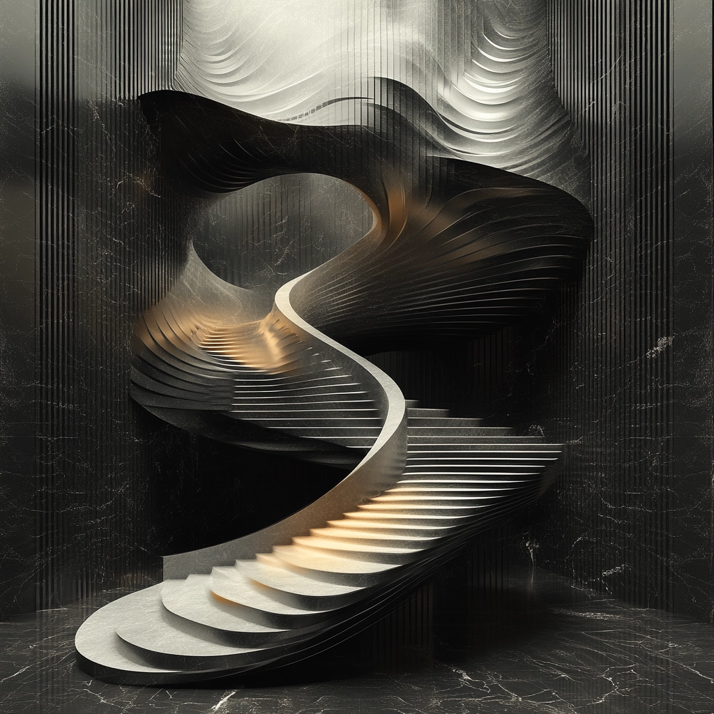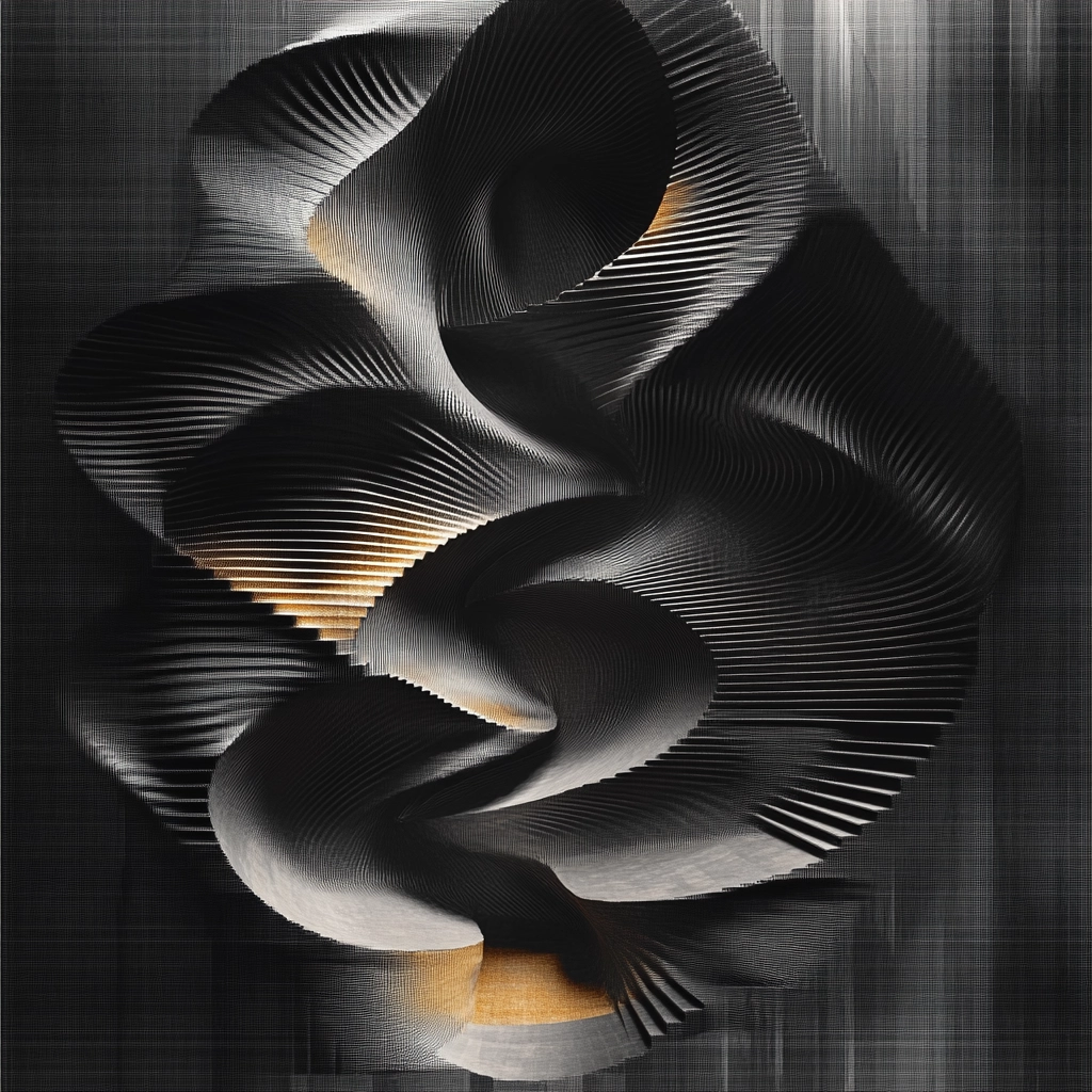 The lighting accentuates the curves and layers of the forms, providing a play of light and shadow that enhances their three-dimensional aspect. The textures appear smooth yet dynamic, creating a sense of depth. The spatial orientation feels sophisticated and elegant.