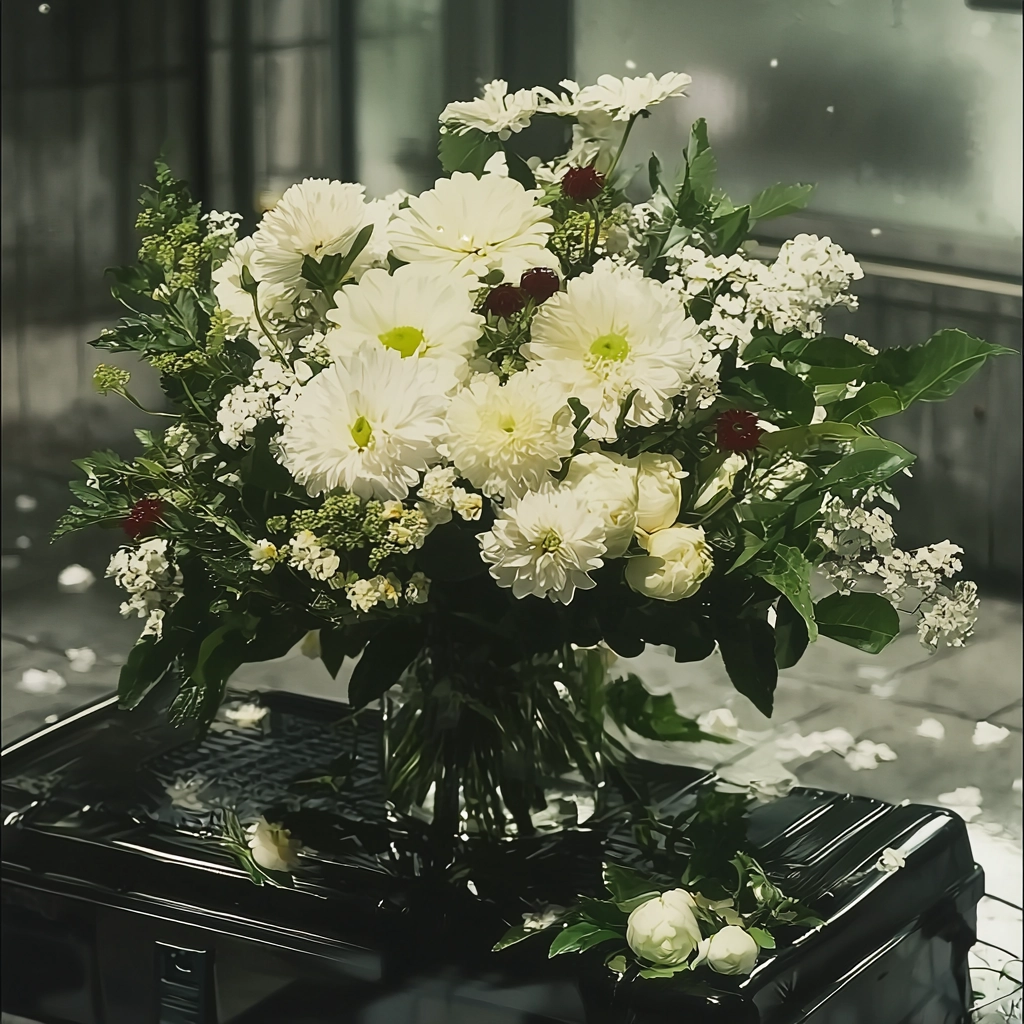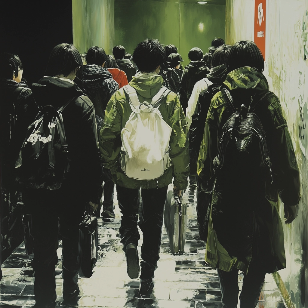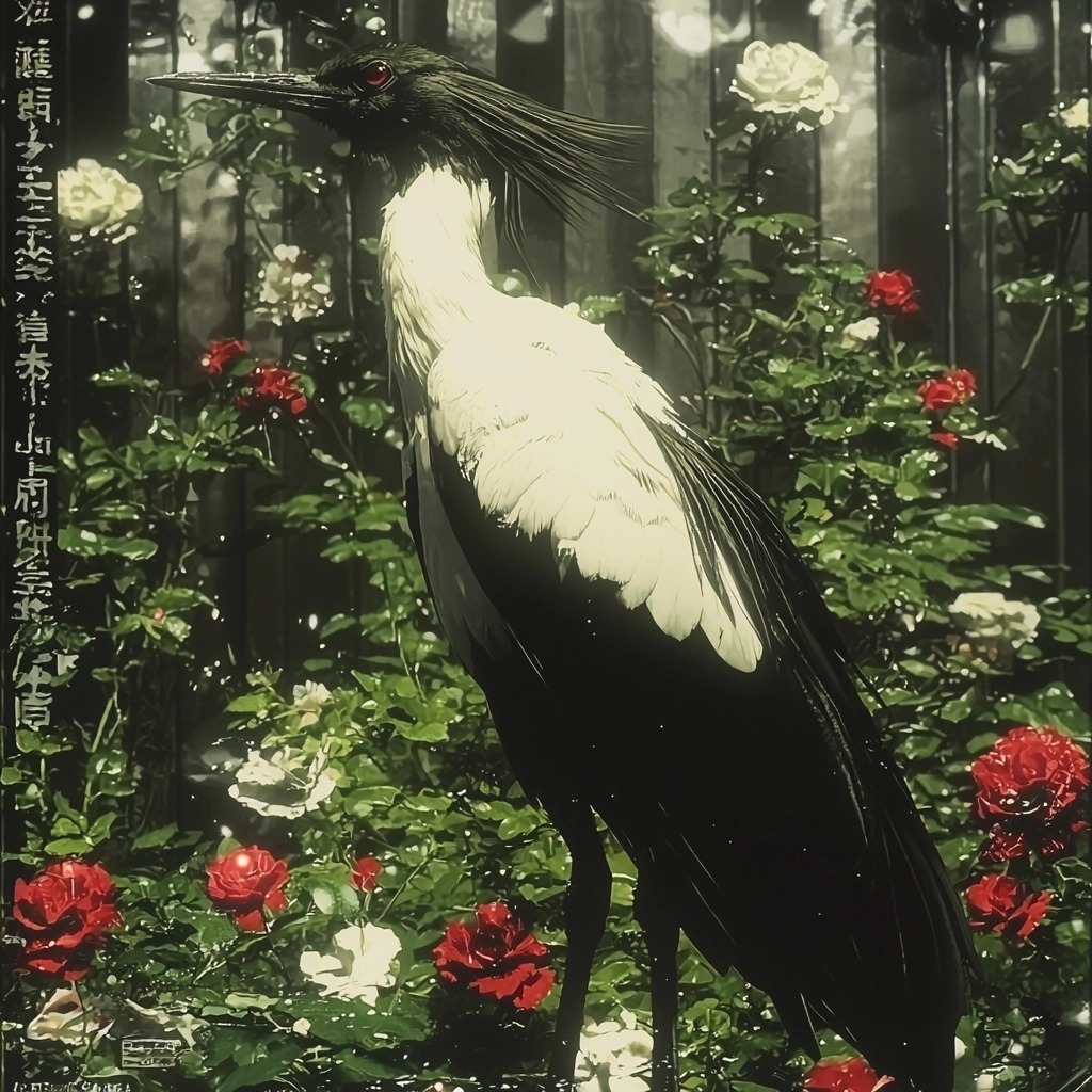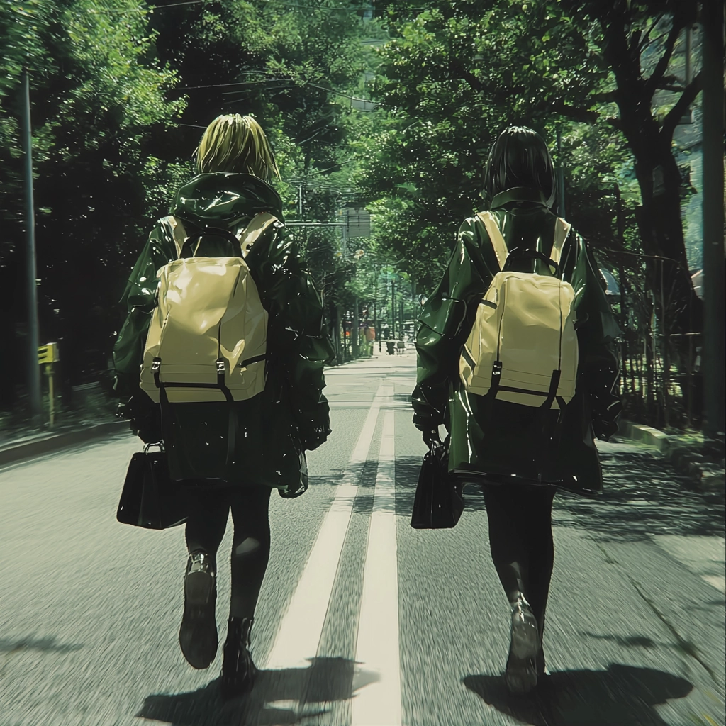The lighting creates strong contrasts, elevating the saturated colors against a backdrop of darker shades. The spatial arrangement offers a dynamic perspective, enhancing the textures depicted through both natural and urban elements.