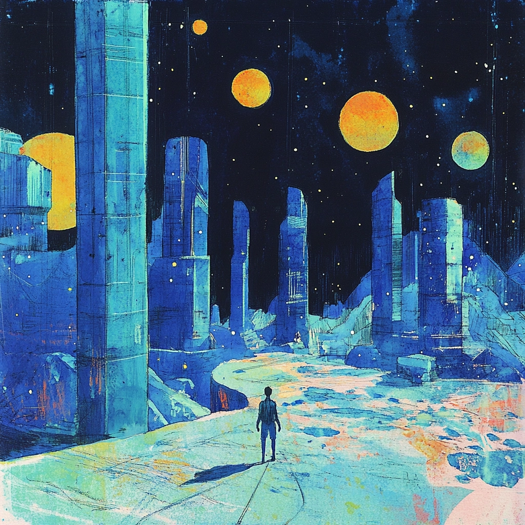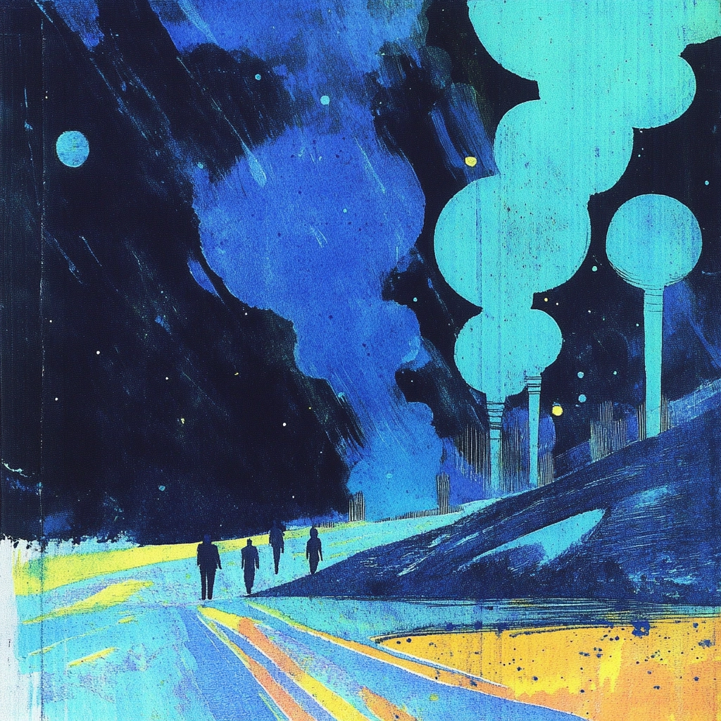 The artwork features intense lighting effects that create vivid contrasts and amplify the deep blue hues. The colors are both bold and harmonious, blending seamlessly into each other. There's a clear spatial sense, with foreground and background elements distinctly defined. The texture is varied, adding depth and intricacy to the scenes.
