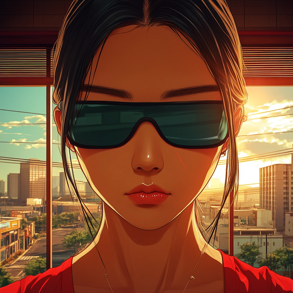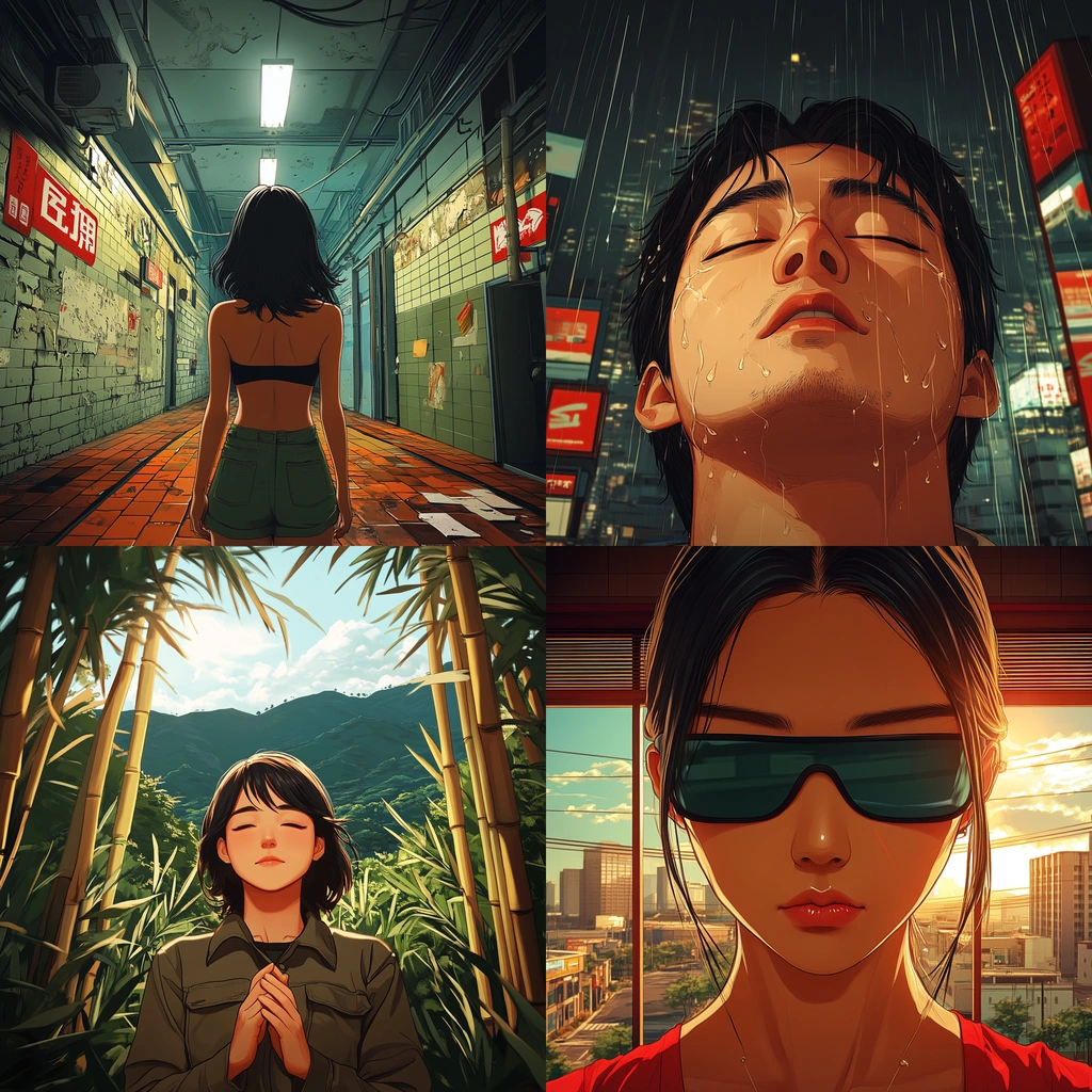 The compositions feature bold color contrasts with a balance of urban and natural elements.