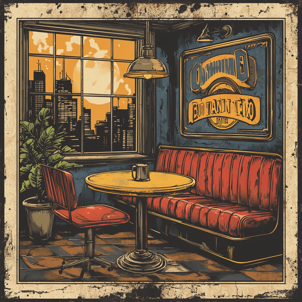 Bold colors with high contrast outlines evoke vintage urban charm.