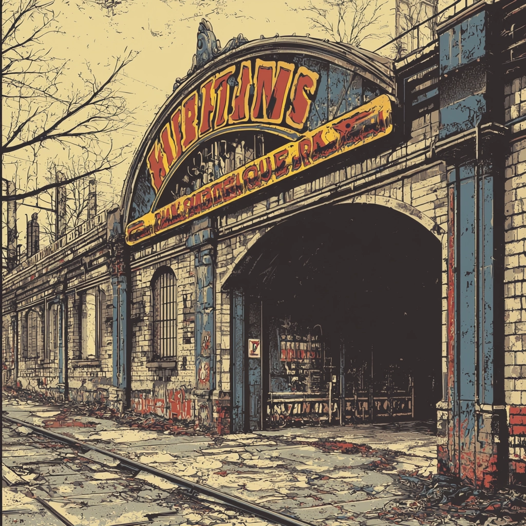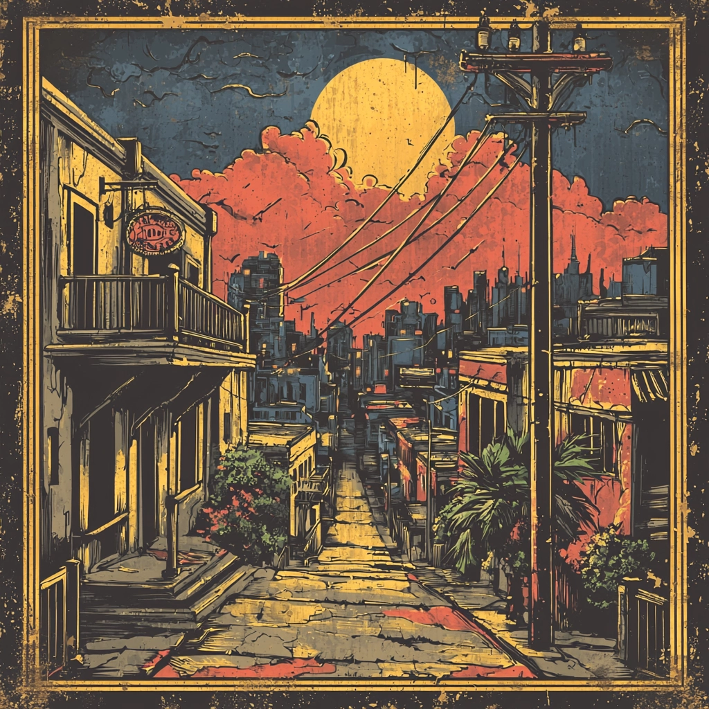 The use of stark lighting brings out the bold, saturated colors against a backdrop of dark, contrasting outlines. Textural elements convey a sense of roughness and grit, enhancing the urban character. Spatial compositions emphasize depth and provide a nostalgic atmosphere through structured layouts.