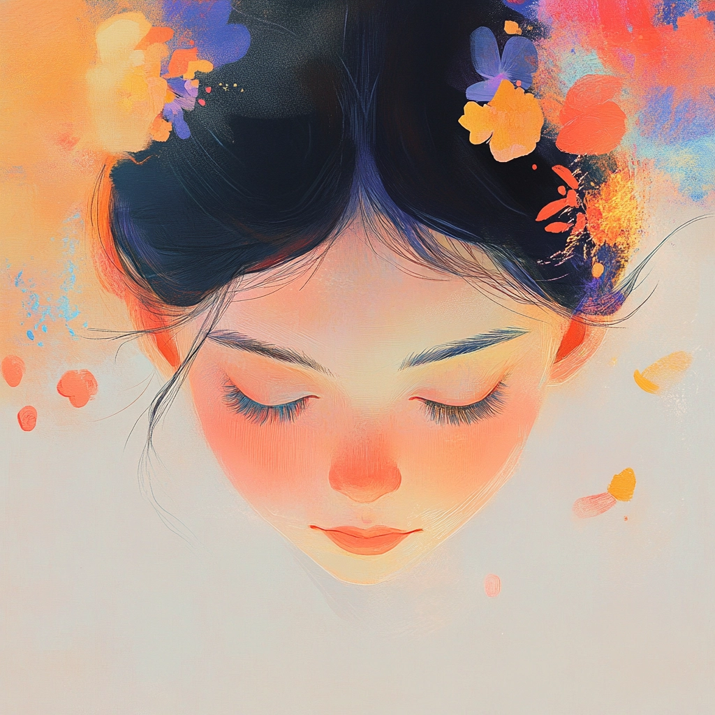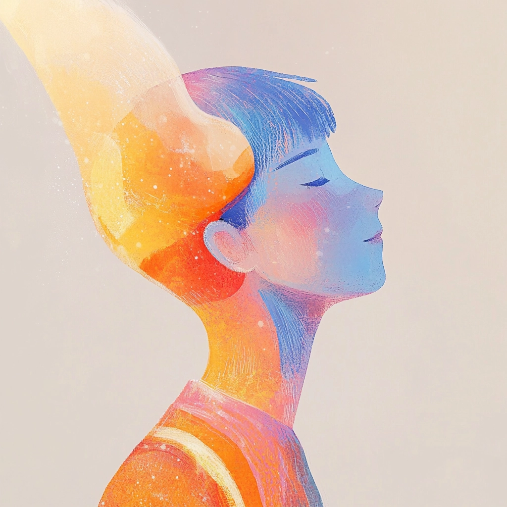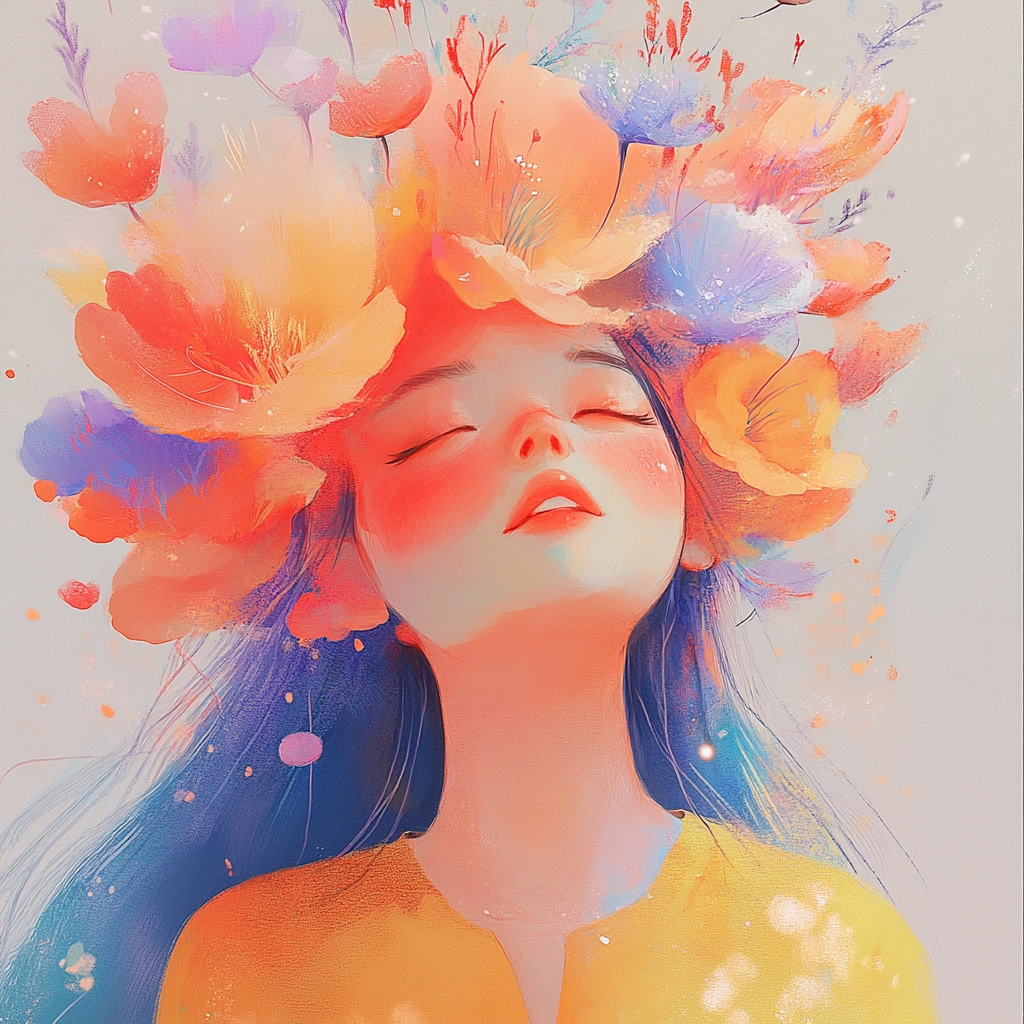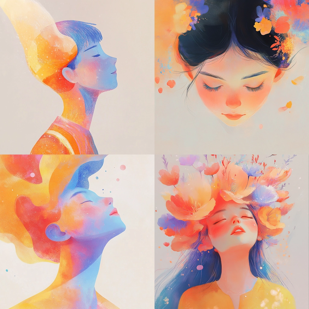 The fluid movement of bright colors, combined with a subtle gradient effect, creates a sense of motion and depth. Light appears diffused, highlighting the translucent quality of forms. Textures are soft, with an emphasis on smooth blending and tonal variation.