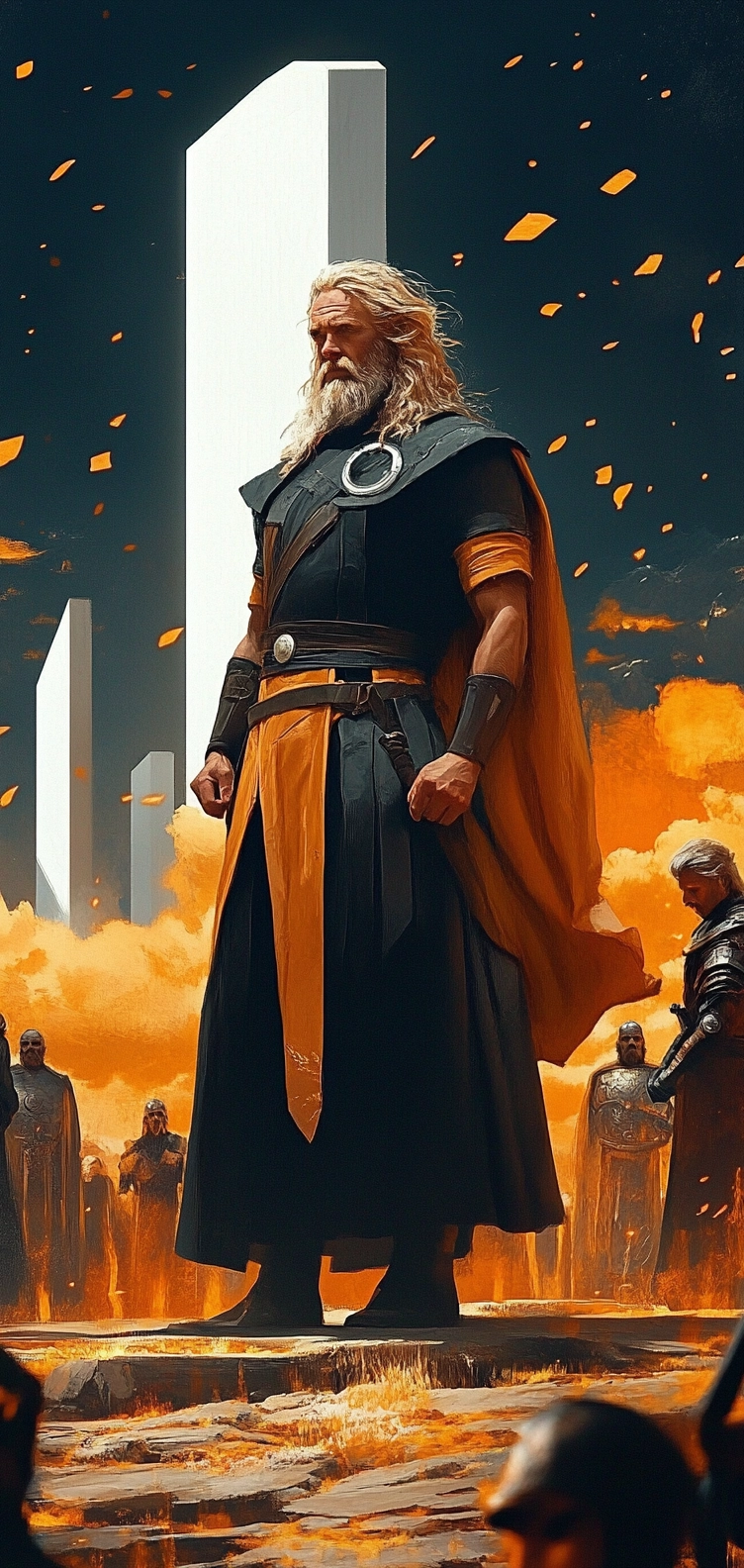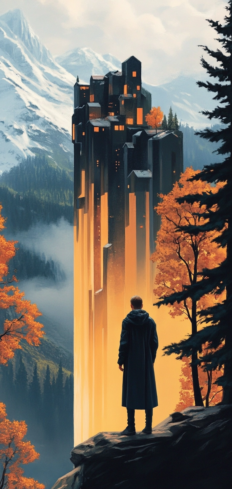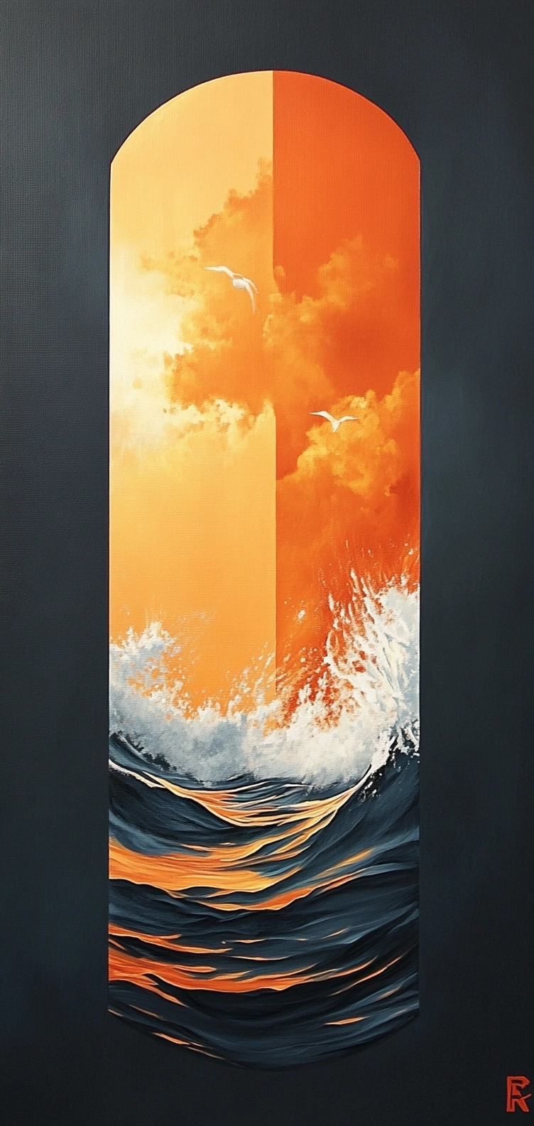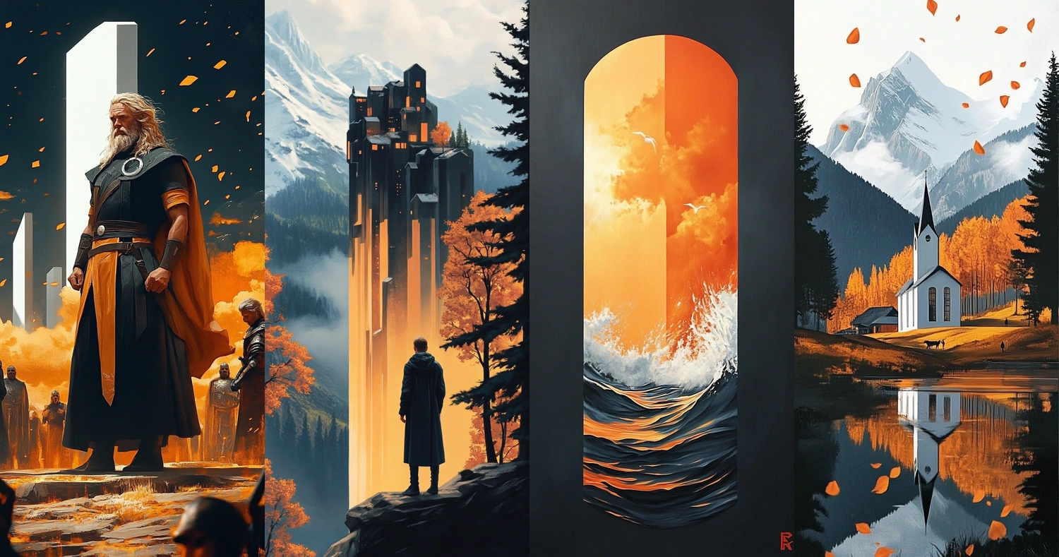 Prominent orange hues provide vibrant contrast against dark elements, while dynamic lighting and detailed texture enhance a sense of depth and movement in the landscapes.