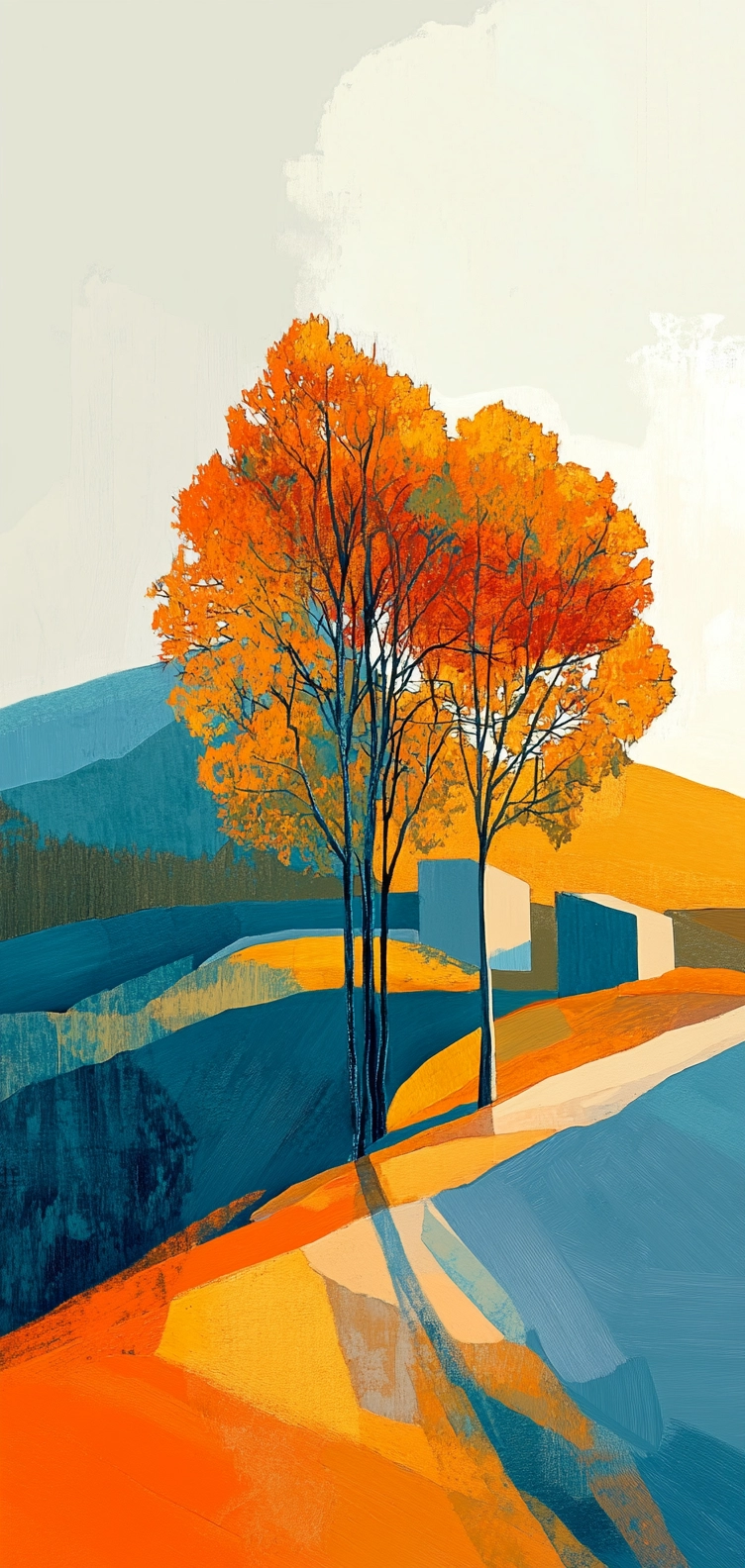 Dynamic juxtaposition of warm and cool hues with vivid reflections and bold contrasts.