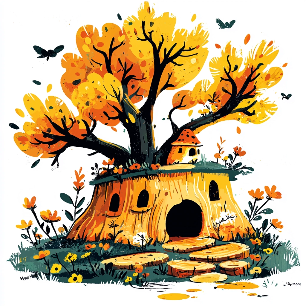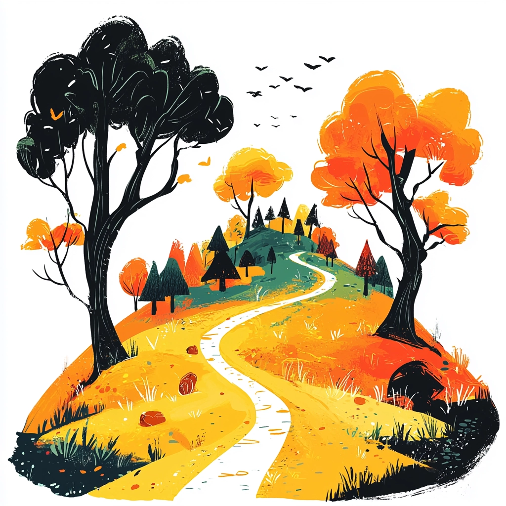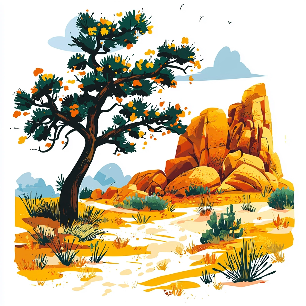 Illuminated by bold sunlight creating high contrast, colors pop vividly with defined black outlines enhancing form. Textured brushwork adds depth to flat areas, suggesting layered detail. Spatial organization appears balanced and expansive.