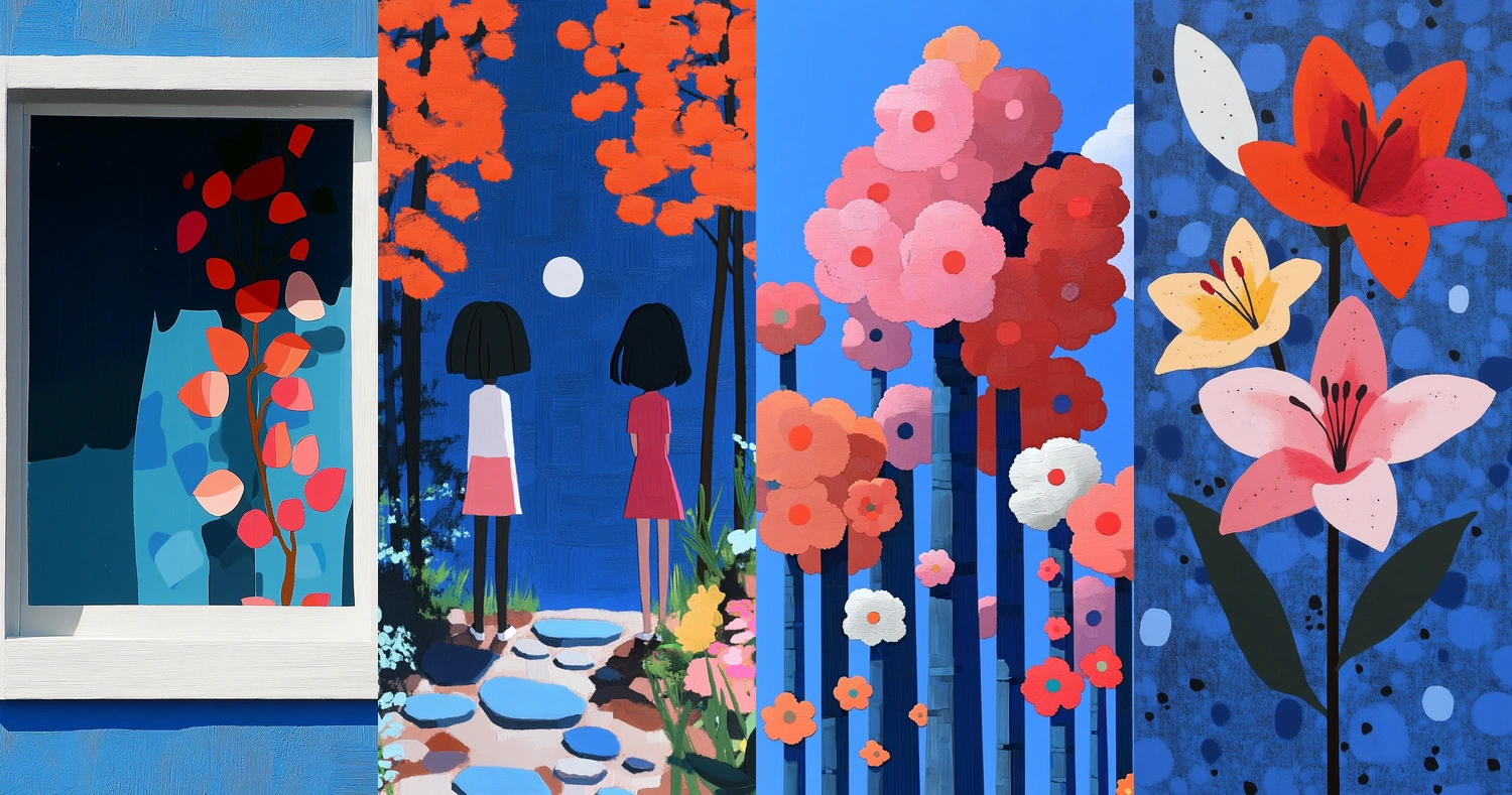 The artwork employs strong lighting effects to highlight vibrant reds against deep blues. The spatial sense is flat yet structured, offering a playful texture with smooth, digital-like finish.