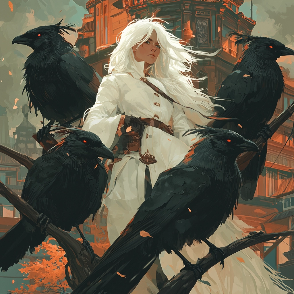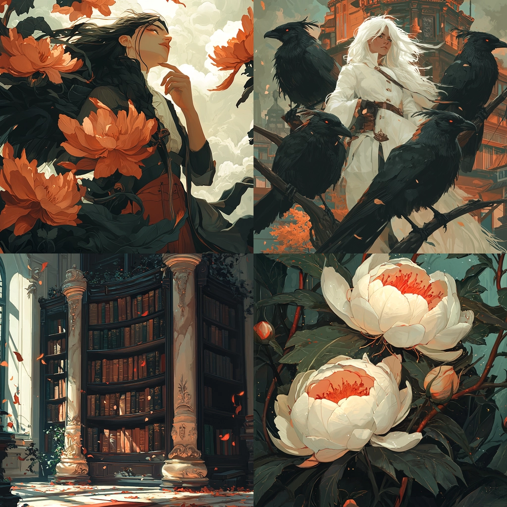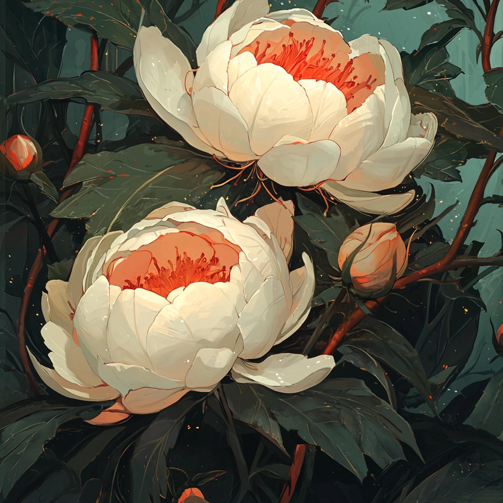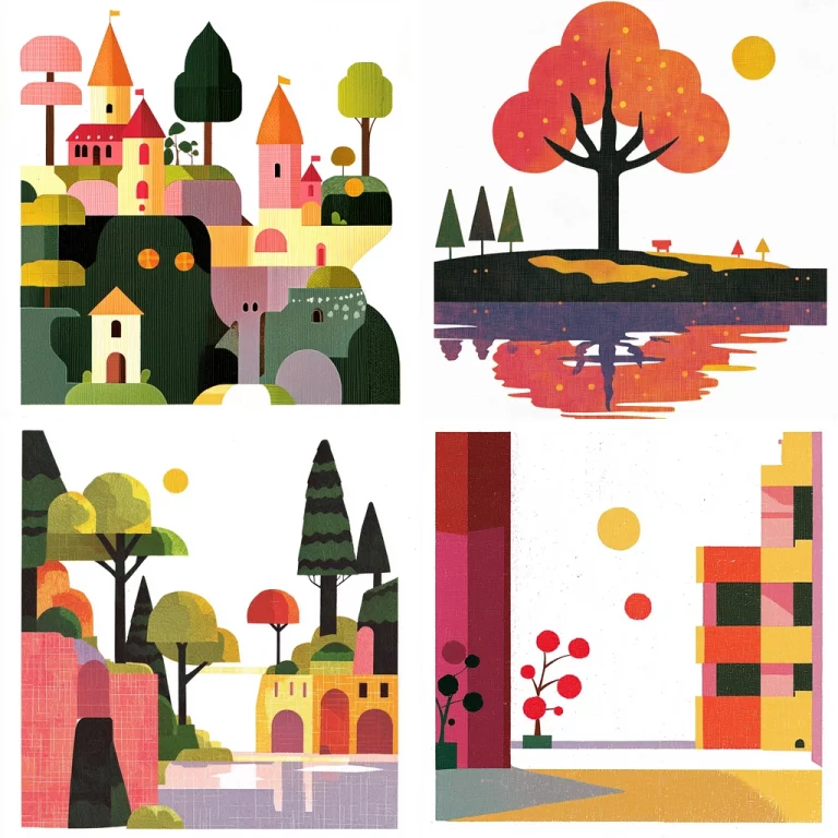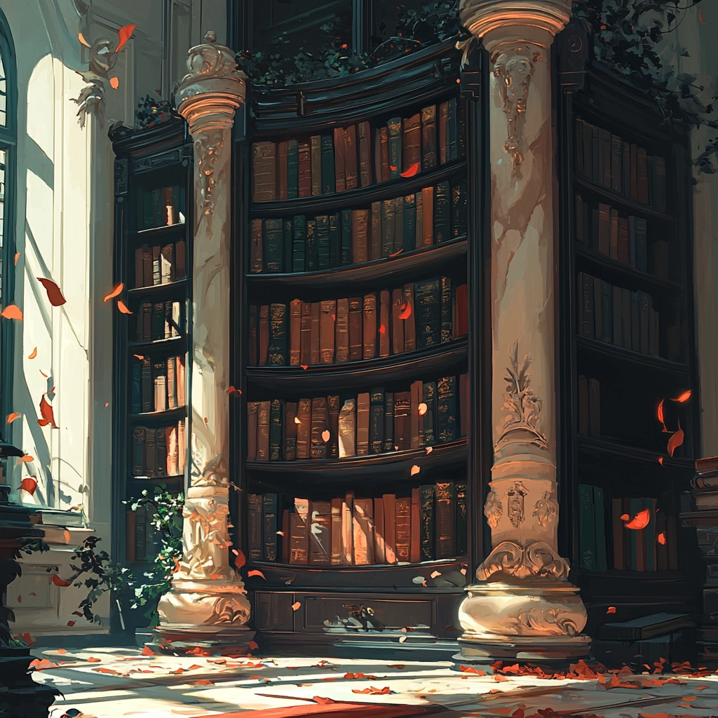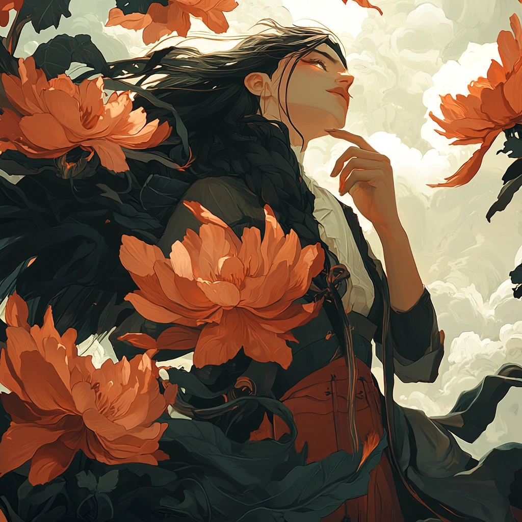 The lighting is dramatic, creating stark contrasts that enhance the depth and dimension of the space. Rich oranges juxtapose against deep greens and dark shades, lending a dynamic and immersive quality. The intricate textures evoke a sense of movement and vibrancy.