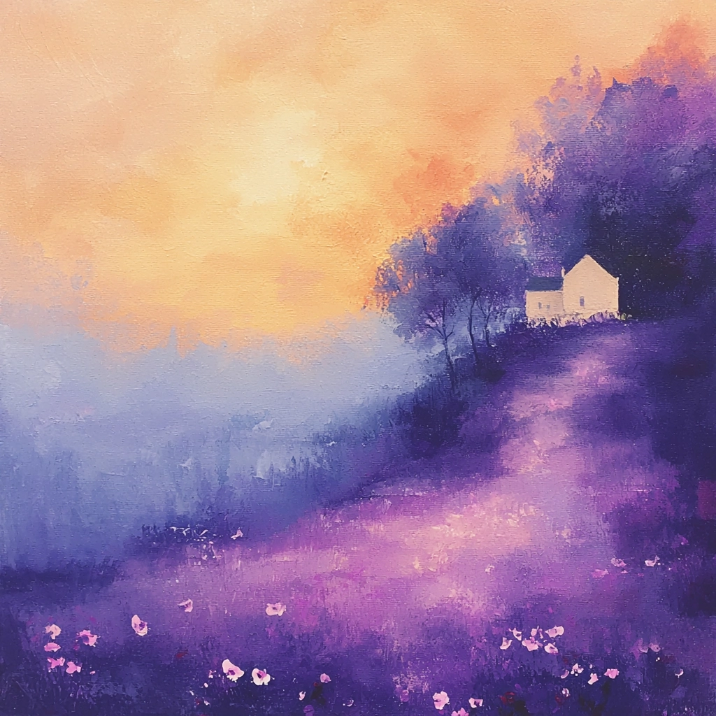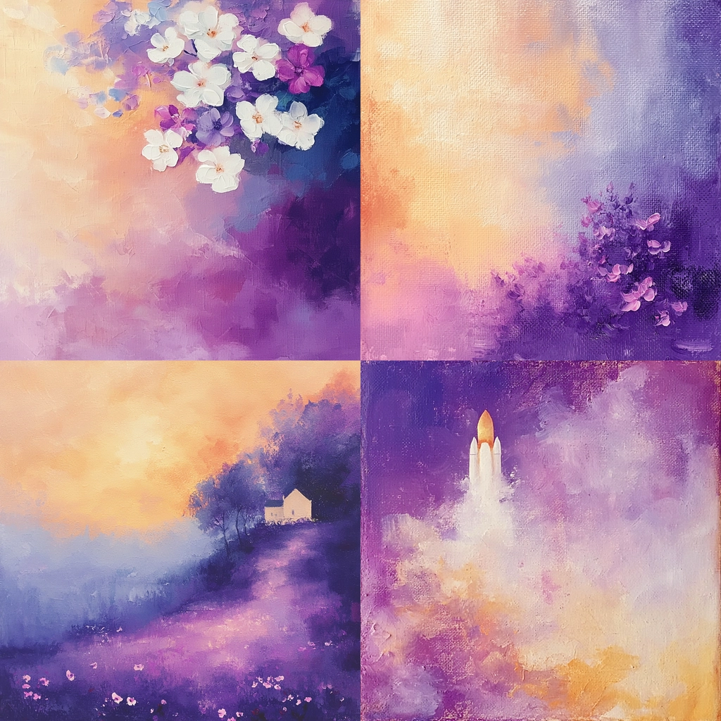 Soft brushstrokes and vivid contrast define the composition, with purple and orange weaving through dynamically. The lighting is subtly diffused, lending depth while textures appear both delicate and robust, enhancing fluid spatial transitions.