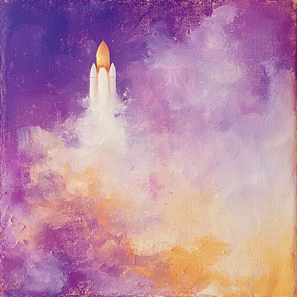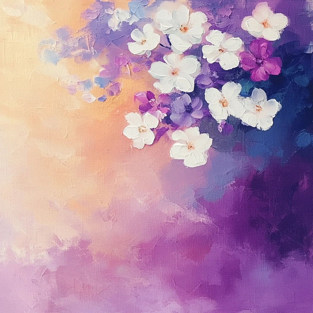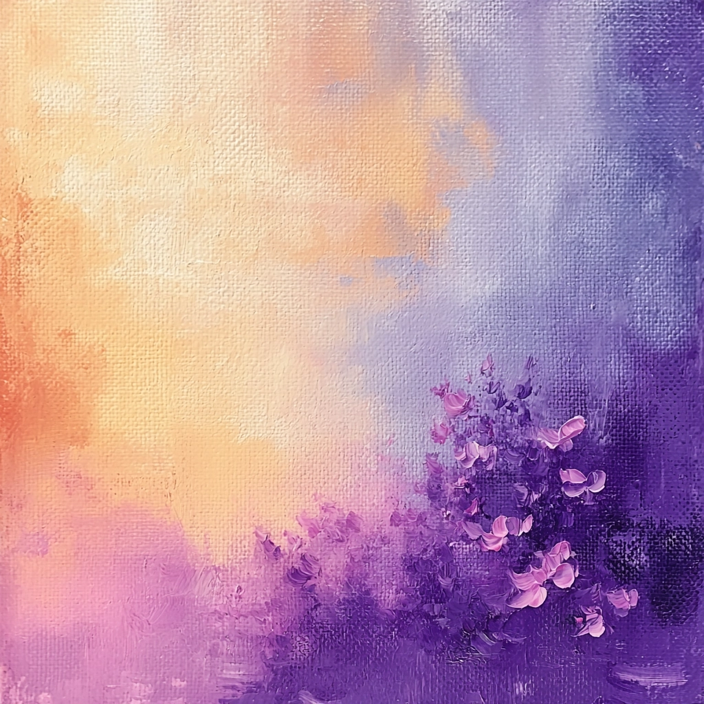 Vibrant hues of purple and orange blend with soft textures and delicate brushwork, creating a lively and intricate visual composition.