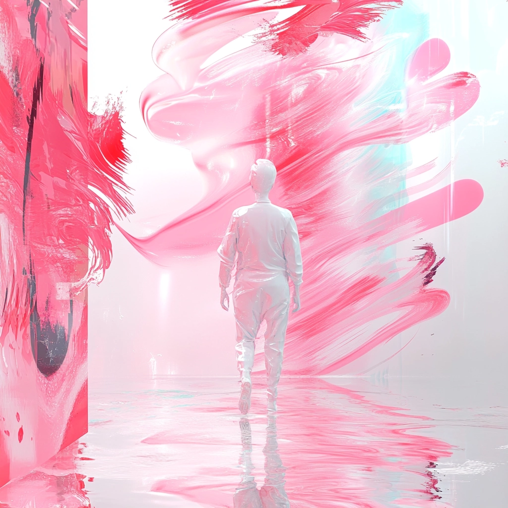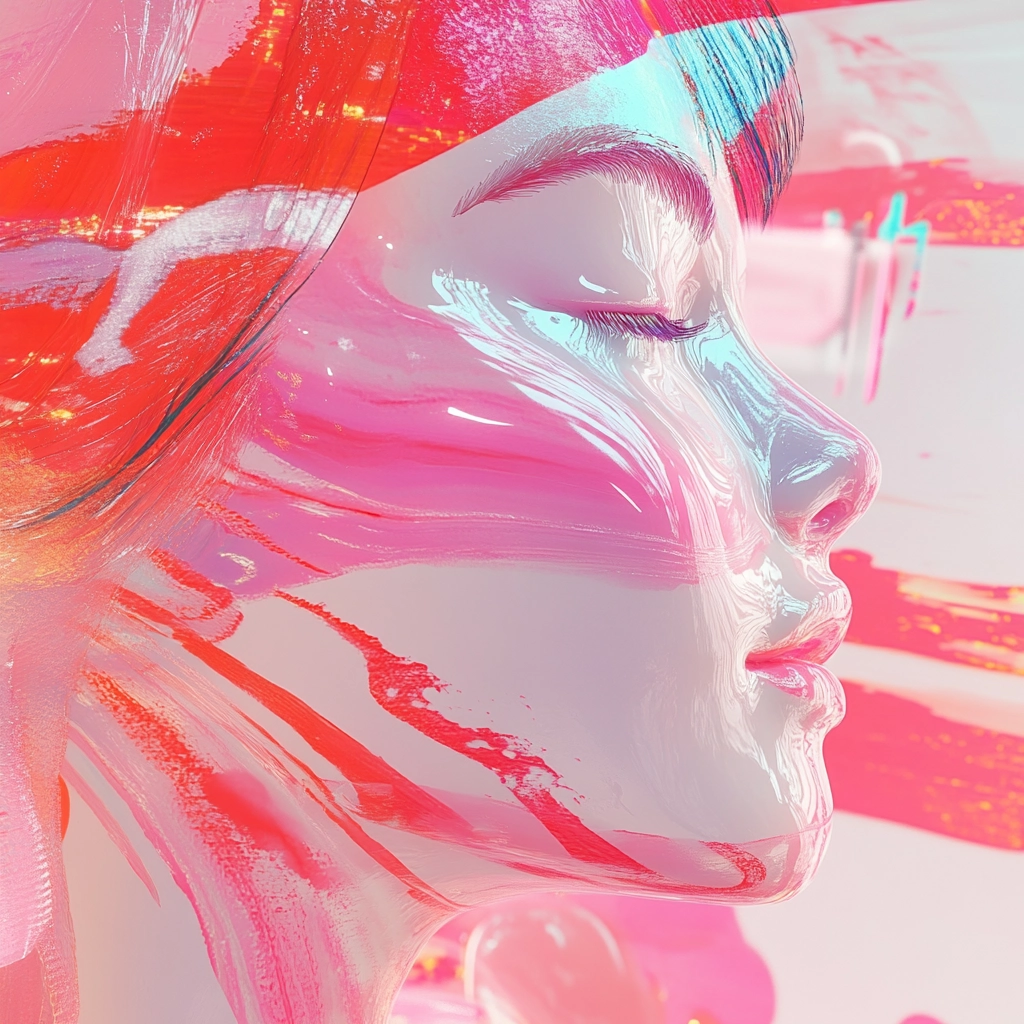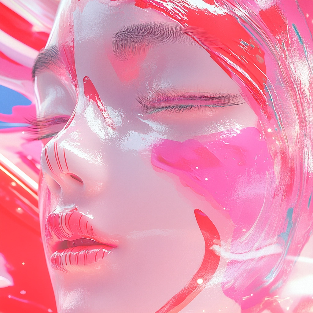 Swirling strokes of pink and red create dynamic movement and a glossy, reflective effect.