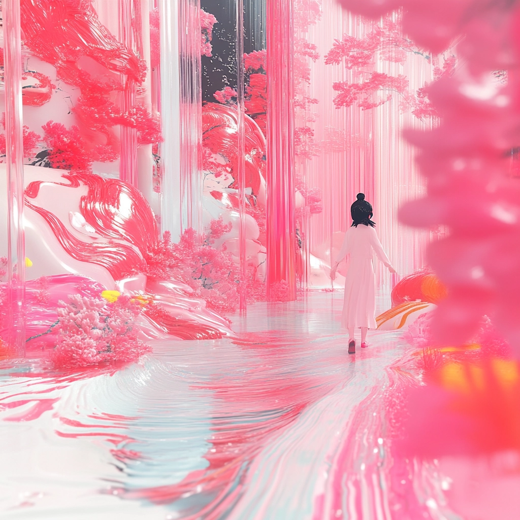 The use of vibrant pink and red is accentuated by glossy surface rendering, contributing to a dynamic and fluid motion. Lighting enhances the reflective quality, creating depth and emphasizing smooth textures and subtle layering effects.
