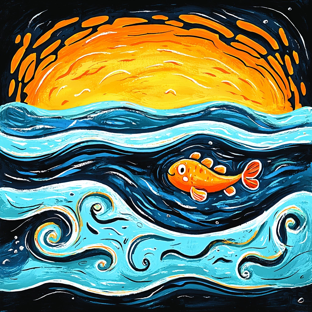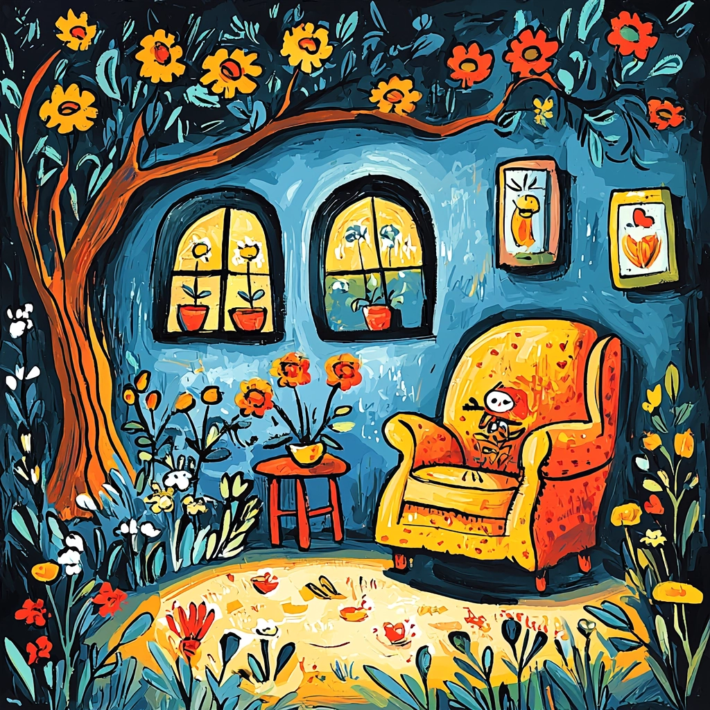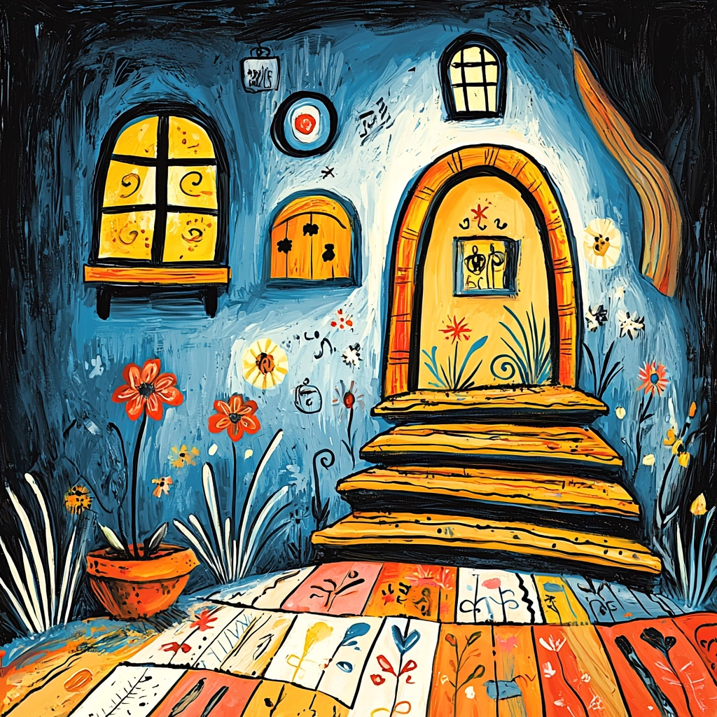 Intense lighting brings out vibrant contrasts between colors. Rich textures simulate depth and movement. Composition is structured around energetic visual elements, providing a spatial sense that is both intimate and expansive.