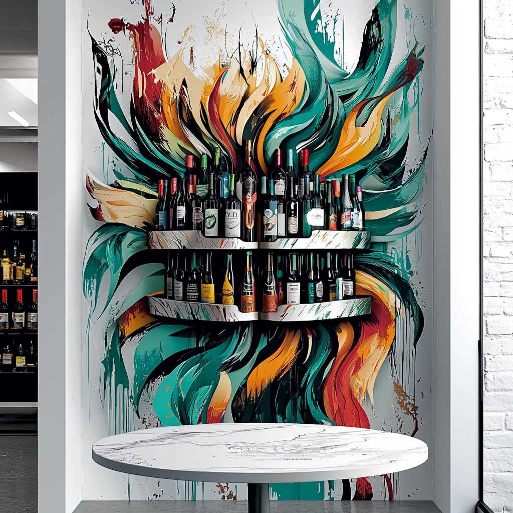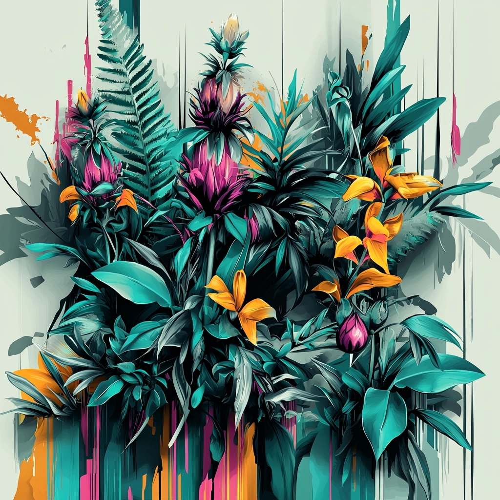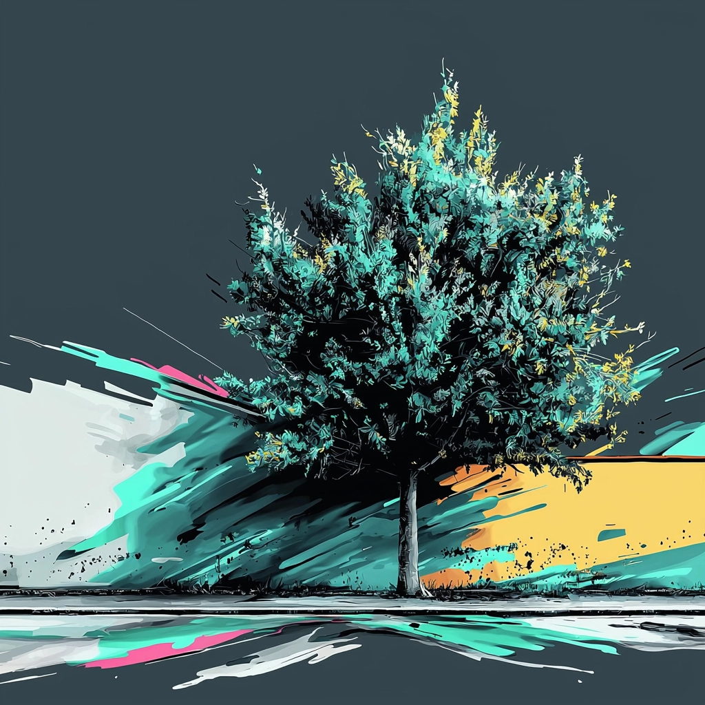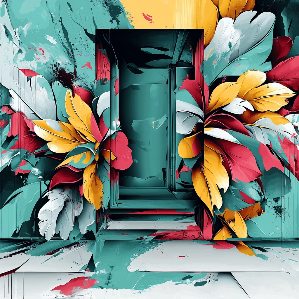 Bright teal and yellows clash against deep reds, creating sharp contrasts and dynamic lighting. Fluid brushstrokes weave dense textures and depths, giving a sense of expansive spatial layering.