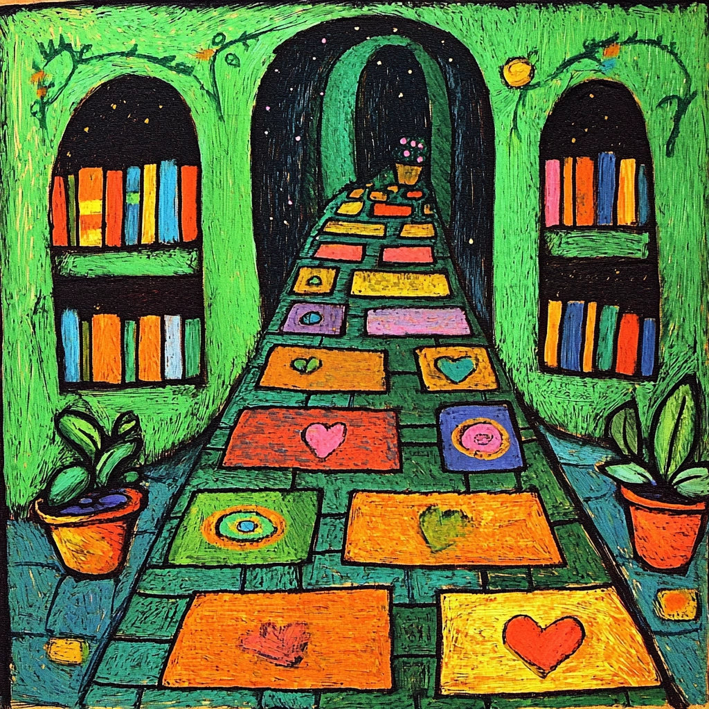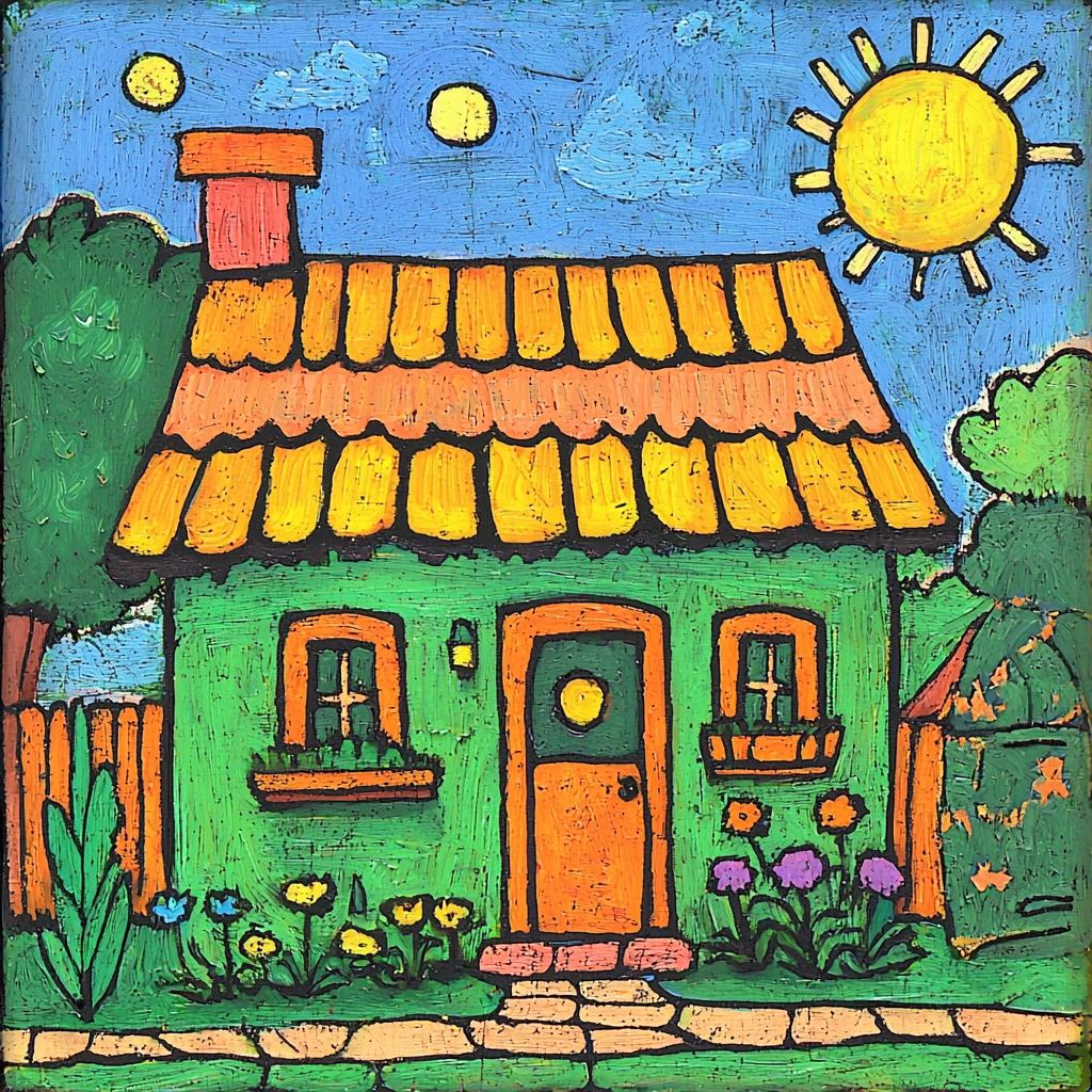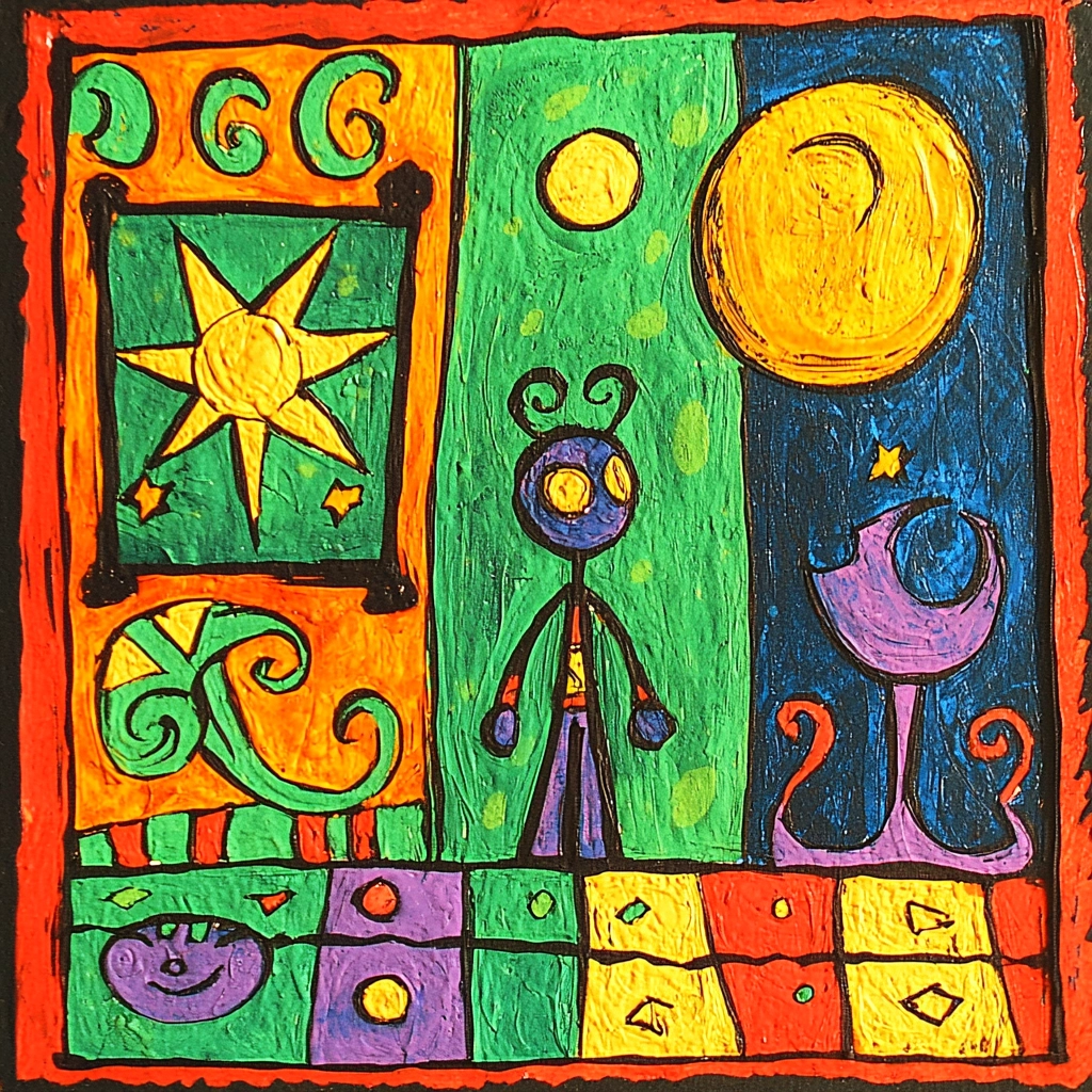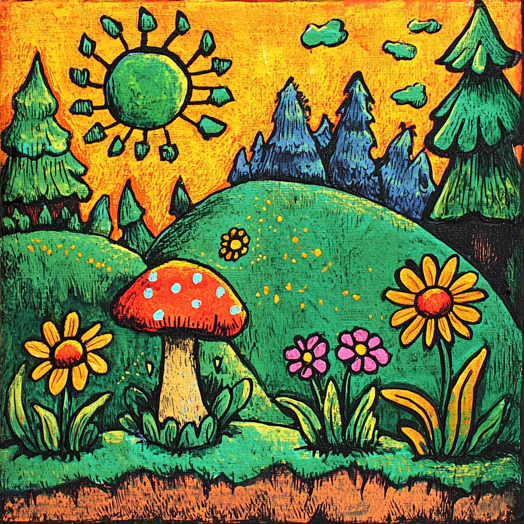 The vibrant palette of greens, oranges, and yellows promotes a lively appearance with pronounced outlines and cartoonish detailing. The depth is subtly expressed through overlapping elements and varied spatial arrangement, enhancing its playful texture.
