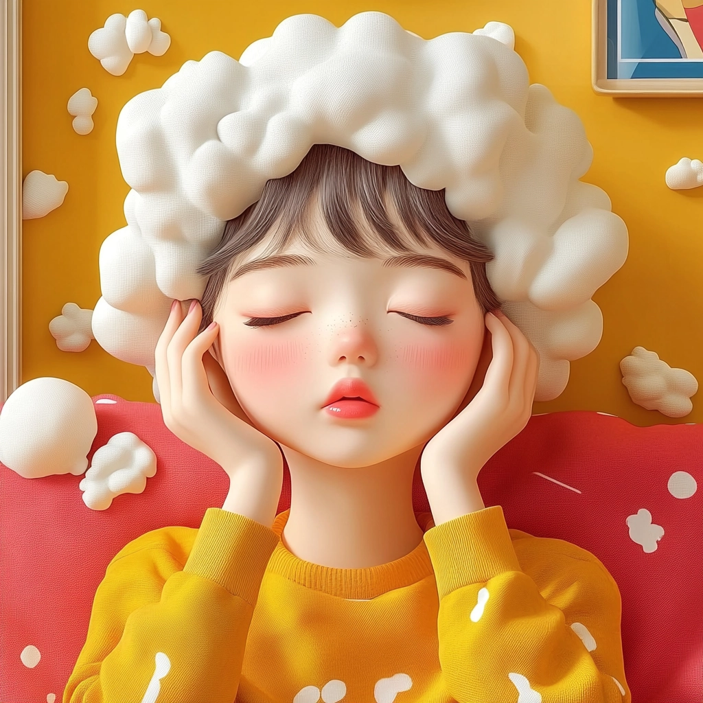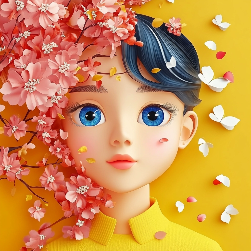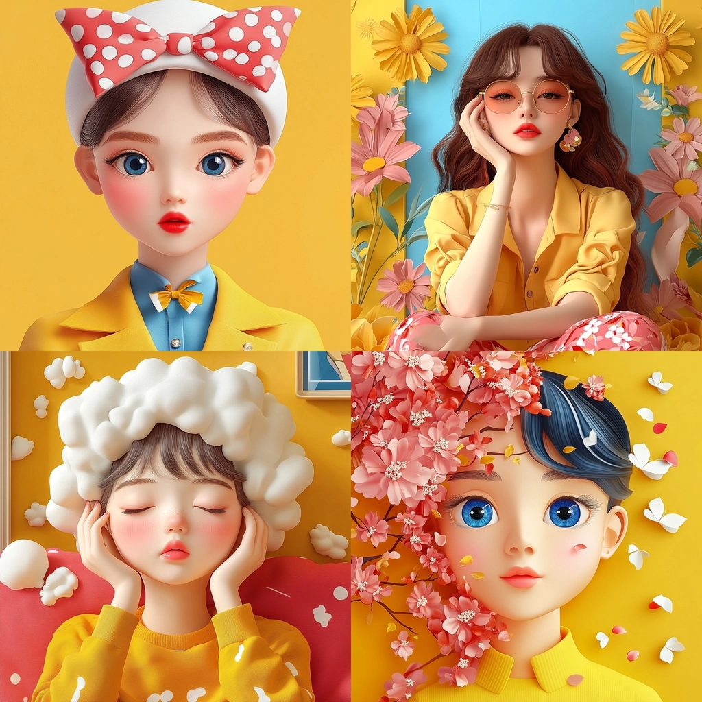 Lighting is soft and creates a gentle contrast, enhancing the vibrant and playful colors. Textures have a realistic feel, resembling natural elements. The spatial arrangement is dynamic, integrating elements harmoniously within the scene.